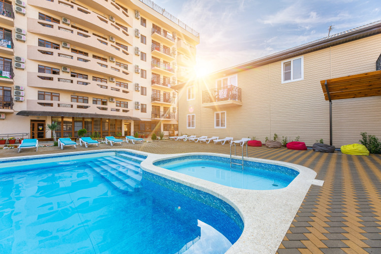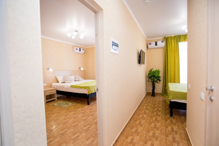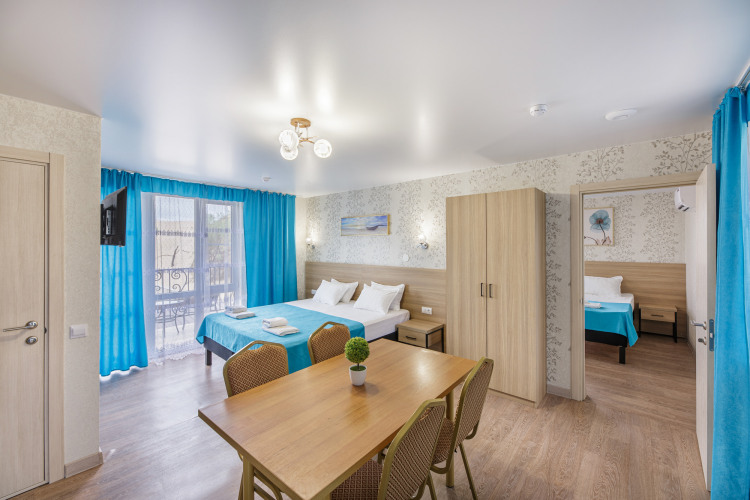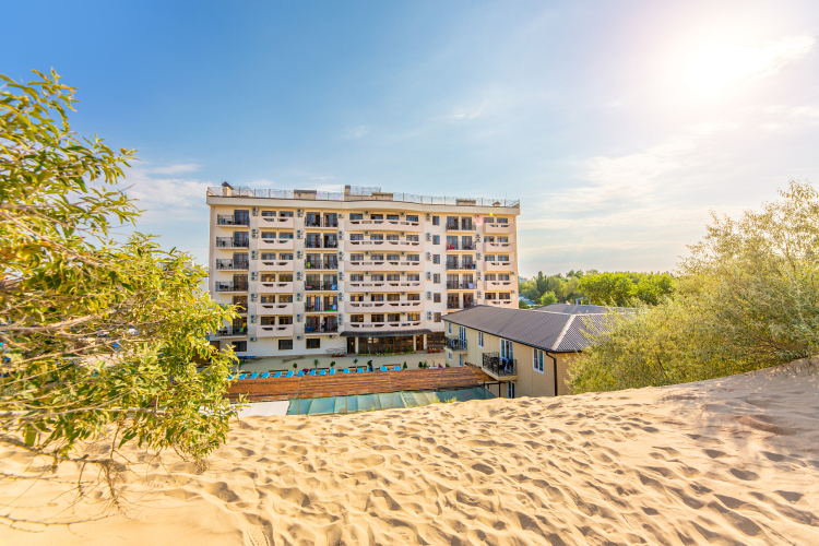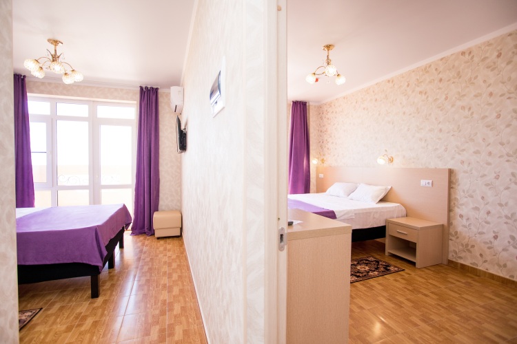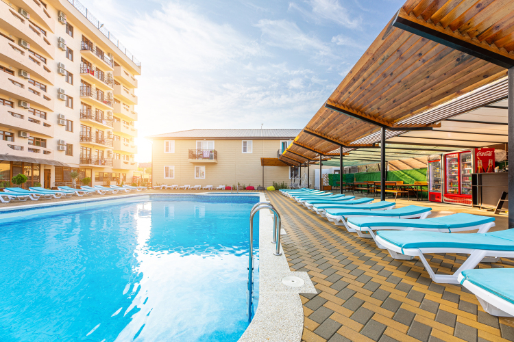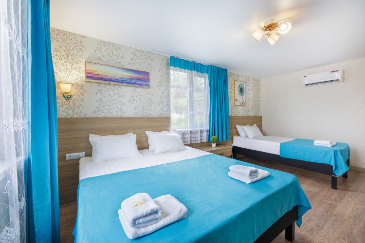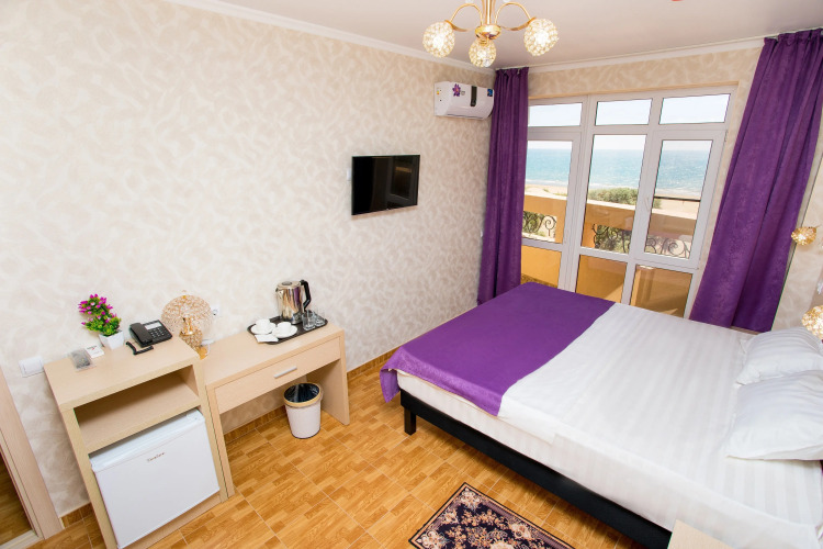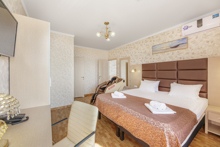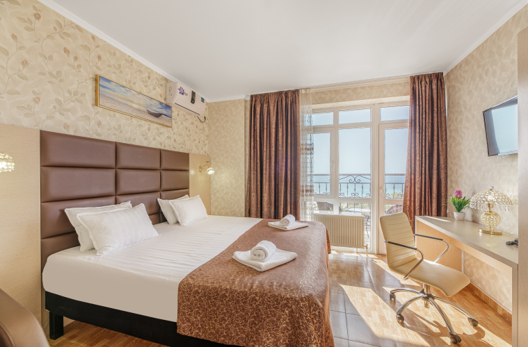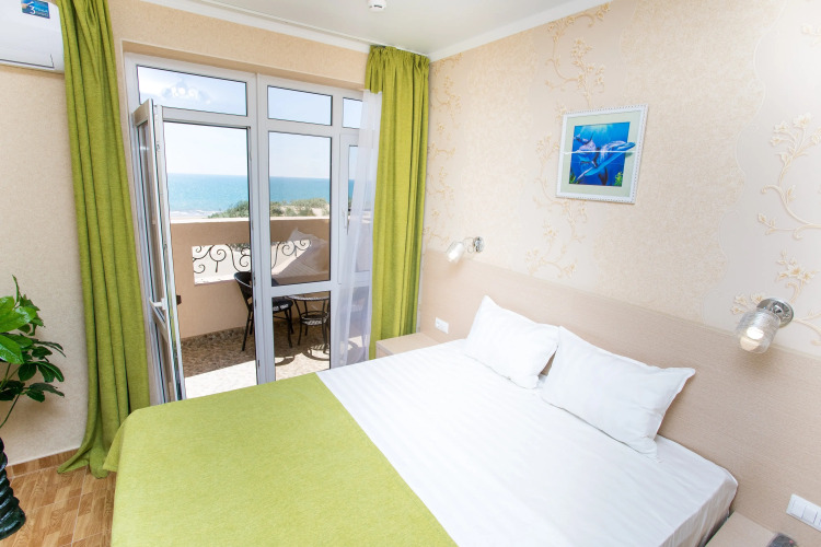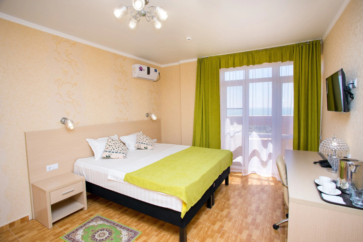 Большое семиэтажное здание отеля способно вместить более 250 отдыхающих. Гостей ожидают комфортабельные номера, оформленные в современном стиле, категорий Стандарт, Люкс, Семейный, Джуниор Сьют. Все они укомплектованы качественной мебелью, сплит-системой, необходимой техникой, в номерах имеются просторные балконы с видом на море. В ванной комнате – душевая кабина, косметические принадлежности, тапочки и халаты.
