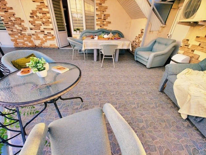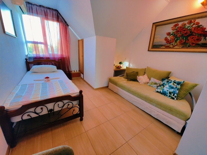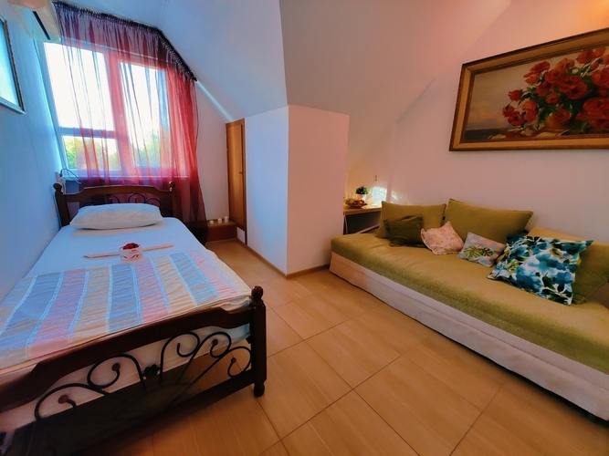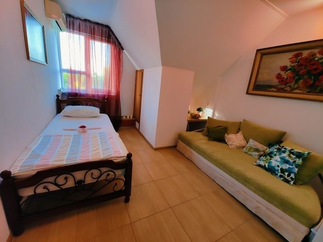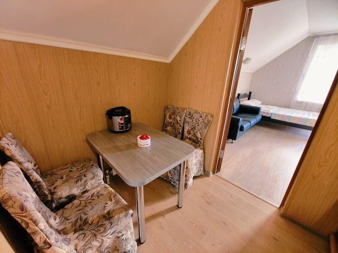 Лучший вариант для отдыха молодой семьи с детьми или большой компании друзей. В номере имеется все необходимое для комфортного отдыха: мини кухня, мультиварка, , мини-холодильник, сплит-система кондиционирования, телевизор. Возможность размещения до 6 человек, в номере две двуспальные кровати и двуспальный диван. Санузел и душ в номере. Номер с индивидуальным балконом и мебелью для отдыха и дополнительно доступна большая общая терраса с зоной отдыха.