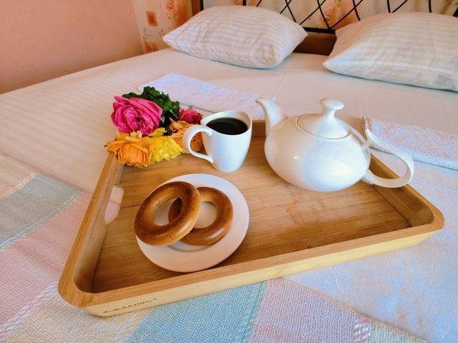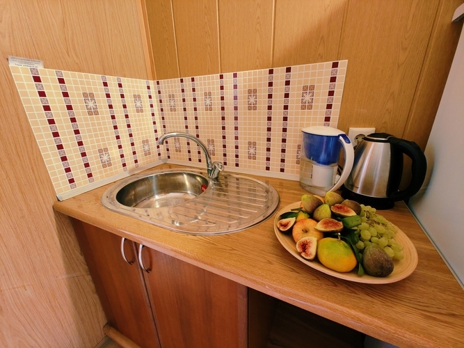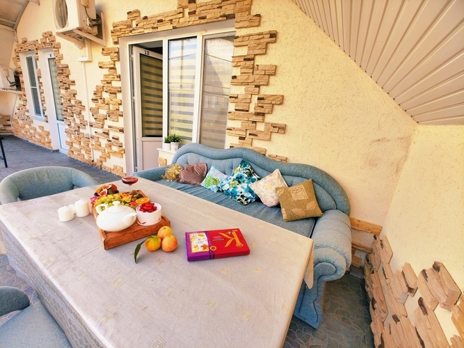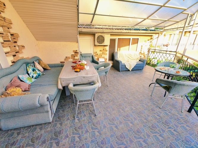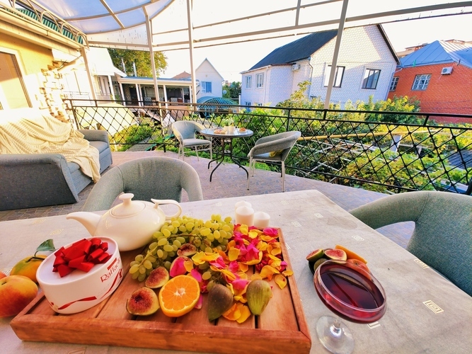 На первом этаже гостевого дома расположена просторная кухня, где имеется все необходимое для приготовления пищи: Микроволновая печь, холодильник, чайник, духовой шкаф, набор необходимой посуды, столовые приборы. На летней террасе расположены столики для отдыха на свежем воздухе. До моря и Центрального пляжа спокойным пешим шагом 20 минут.