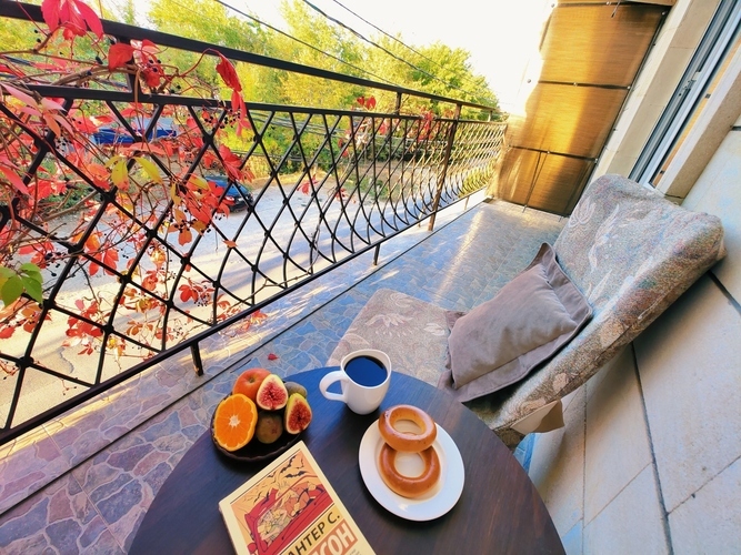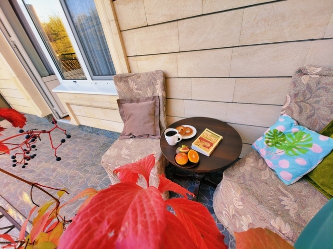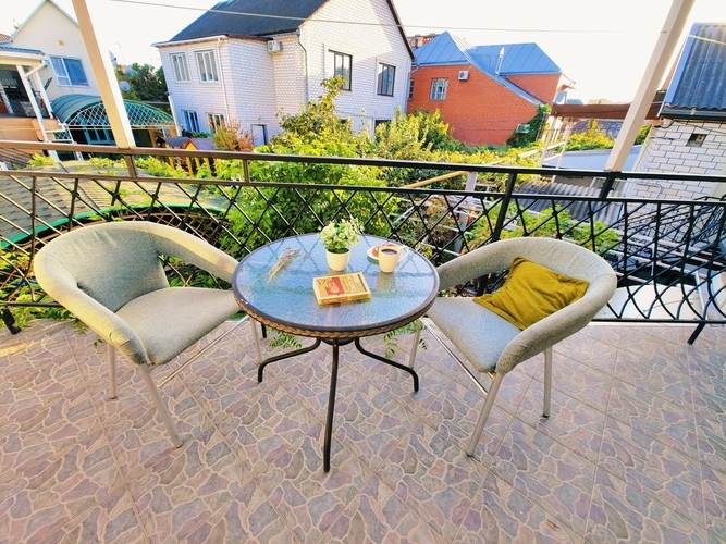 Лучший вариант для отдыха молодой семьи с детьми или большой компании друзей. В номере имеется все необходимое для комфортного отдыха: мини-кухня, мультиварка, чайник, набор посуды, столовые приборы, мини-холодильник, сплит-система кондиционирования, телевизор. Возможность размещения до 5 человек, в номере две двуспальные кровать и кресло-кровать. Номер с индивидуальным балконом и мебелью для отдыха и дополнительно доступна большая общая терраса с зоной отдыха.