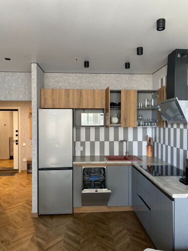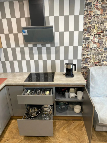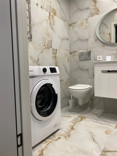 В спальне двуспальная кровать с ортопедическим матрасом и подушками, туалетный столик, диван-кушетка. Ванная комната оборудована душевой кабиной.