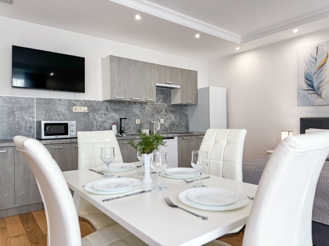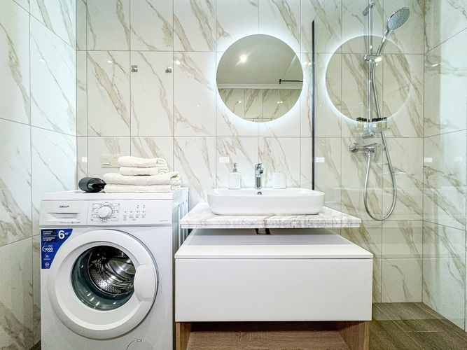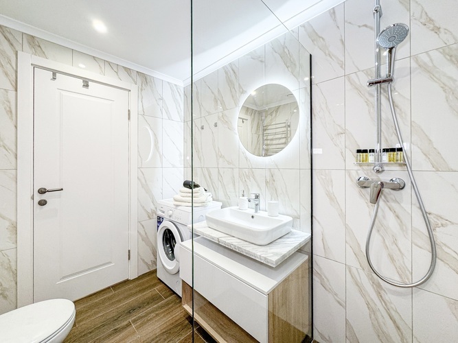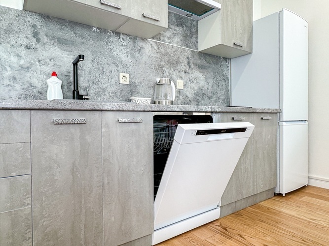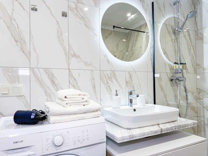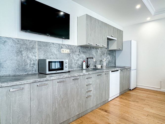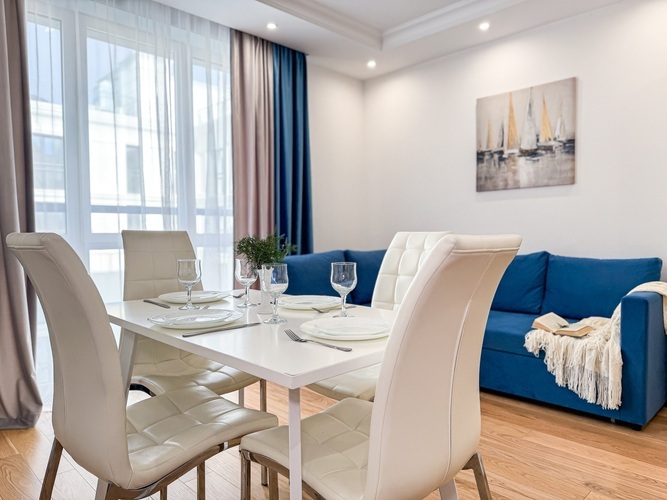 В апартаментах: Полноценная кухня со всей необходимой посудой, обеденный стол, 4 стула, холодильник, посудомоечная машина, микроволновка, чайник, электроплита. Фен, сушилка для белья, гладильная доска и т.д. Для просмотра любимых передач и кино - большой современный телевизор с функцией Smart TV. Высокоскоростной Wi-Fi, подключено более 100 каналов и бесплатный доступ к онлайн-кинотеатру Wink. Количество спальных мест - 4 Двуспальная кровать с ортопедическим матрасом и двуспальный диван.