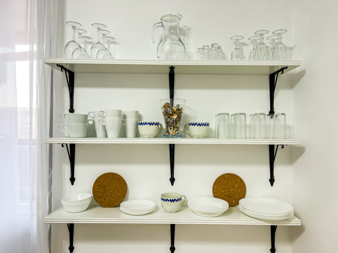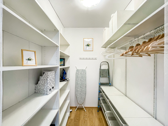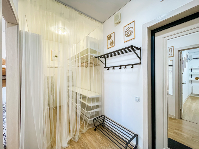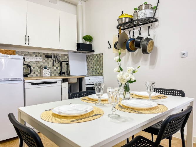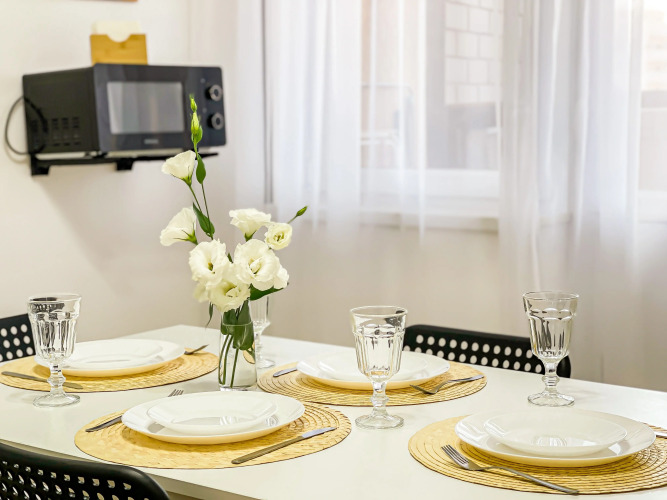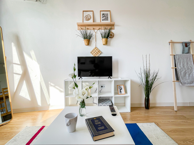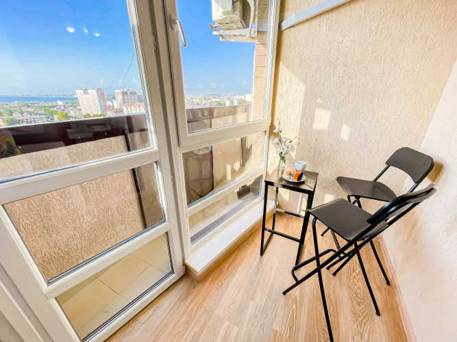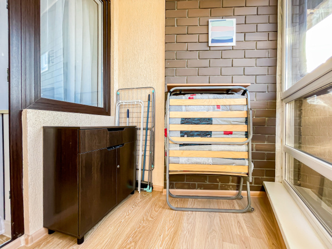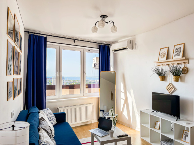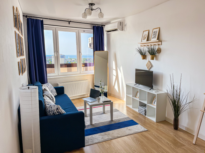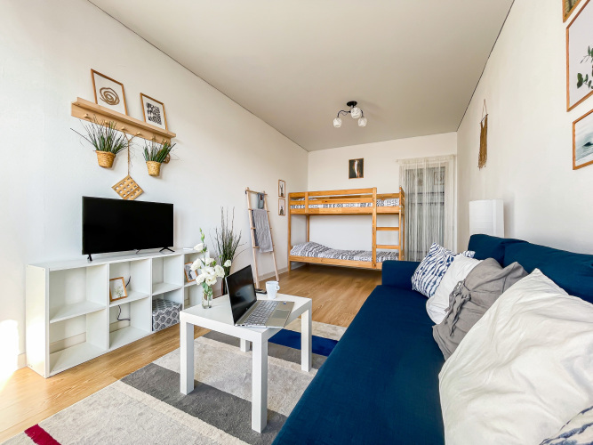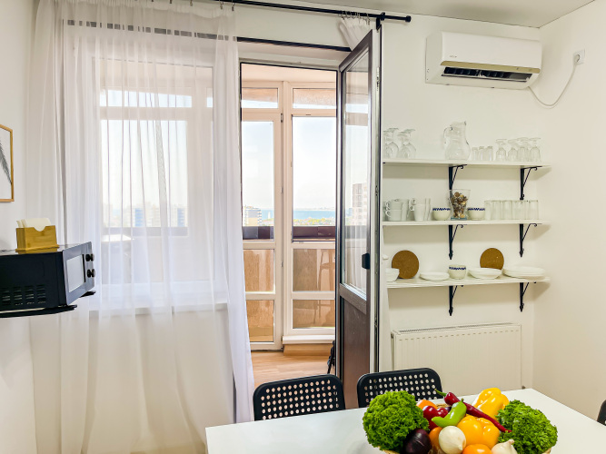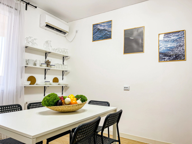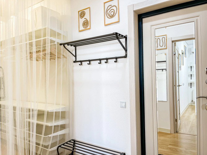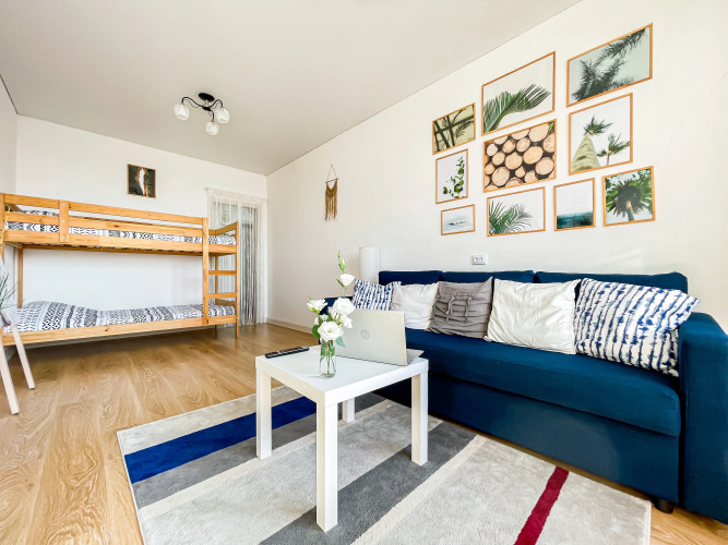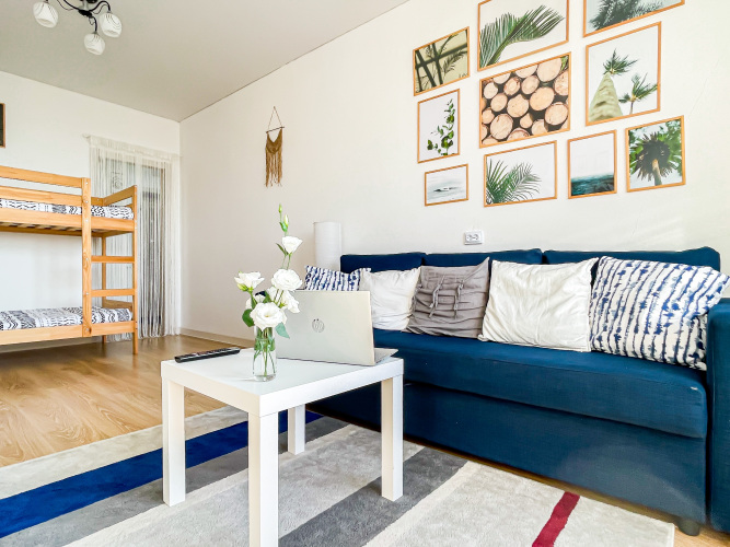 В распоряжении гостей есть: посуда, плита с духовкой, стиральная и посудомоечная машины, гладильные принадлежности, кухонная утварь, 2 кондиционера, бойлер, гардеробная. Гостям предоставляются 5 спальных мест: двуспальный диван, двухъярусная кровать и раскладушка с матрасом. В апартаментах есть бесплатный Wi-Fi и Smart TV.