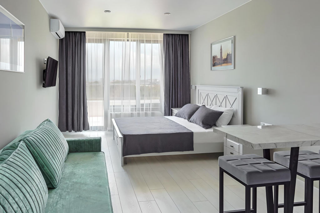 В номере гостей ждут телевизор и халат. Оснащение зависит от выбранной категории номера.