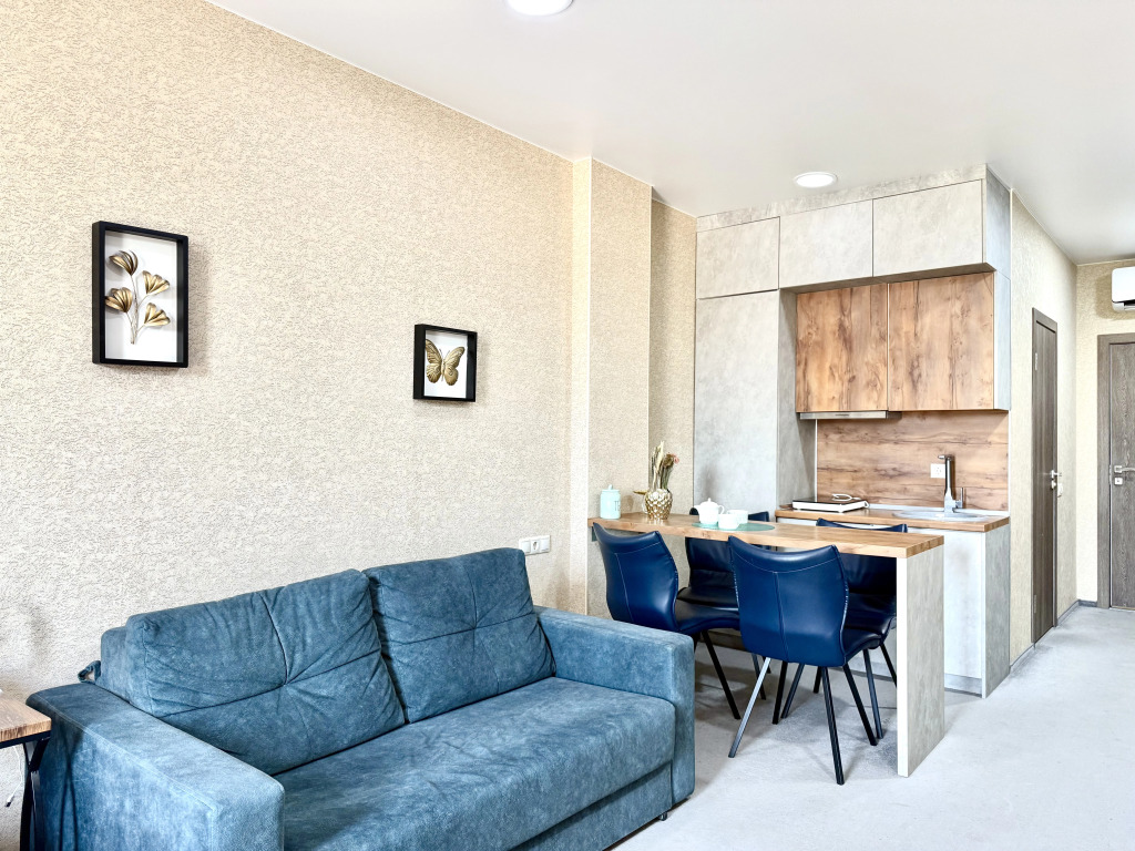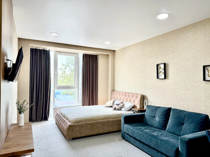 Апартаменты оснащены двуспальной кроватью и раскладным диваном, кухней с варочной панелью, холодильником, микроволновой печью, чайником и набором посуды, а также бытовой техникой, такой как кондиционер, телевизор, высокоскоростной Wi-Fi, стиральная машина, комплект постельного белья и полотенец.