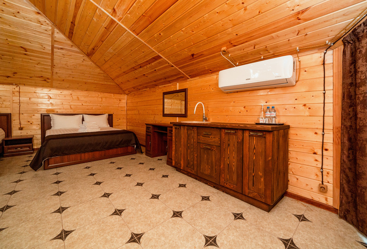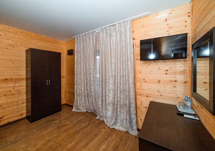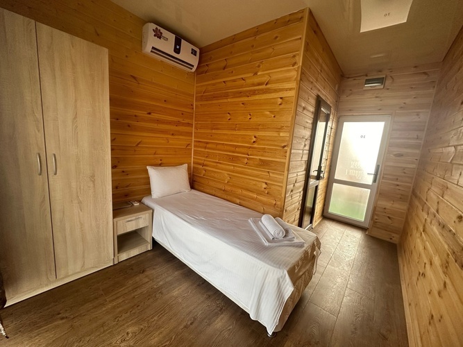 Уютный однокомнатный одноместный номер с односпальной кроватью, расположен на втором этаже эко-корпуса. Номер выполнен из экологически чистого дерева. Прекрасный вариант для одноместного размещения. Номер оборудован всем необходимым для комфортного отдыха. В номере есть мини-холодильник, телевизор, кондиционер, Wi-Fi. В ванной комнате есть душ, зеркало, фен, полотенца, туалетные и косметические принадлежности.