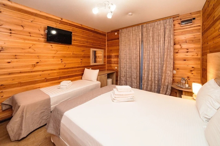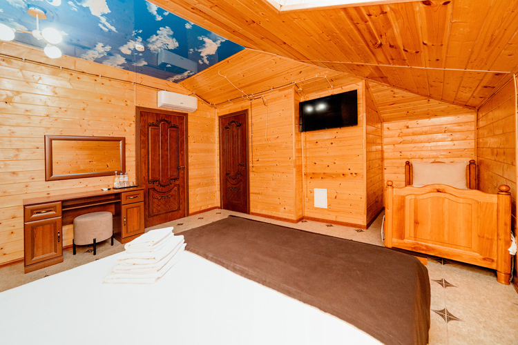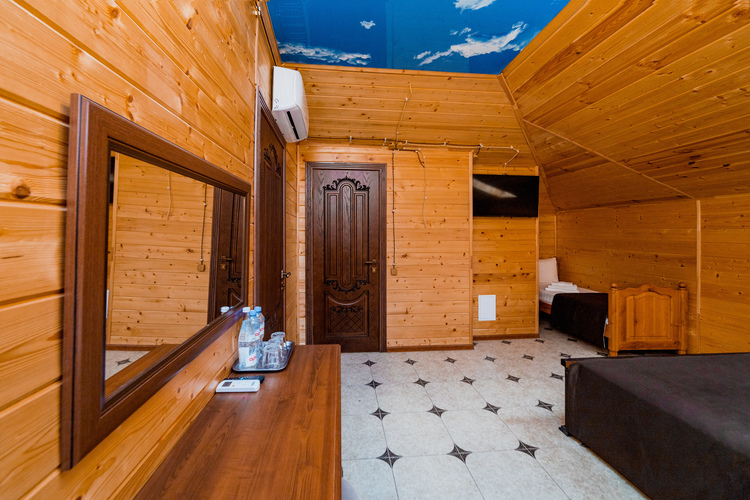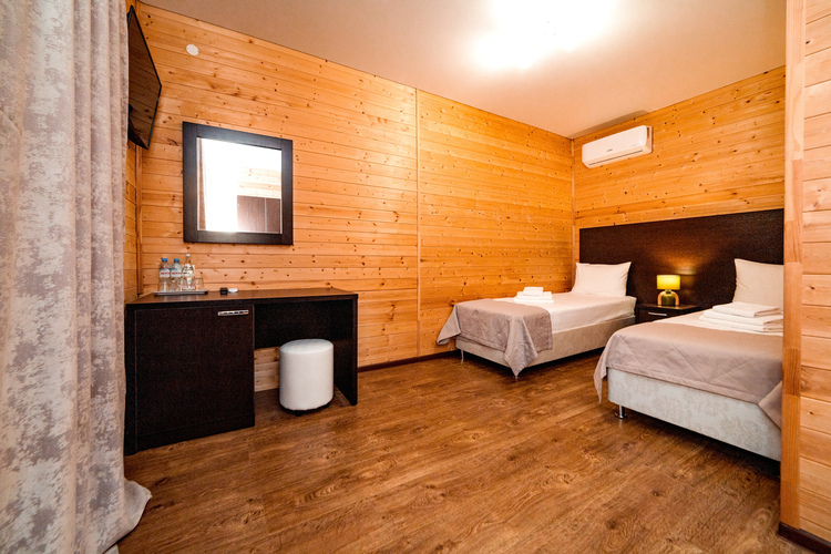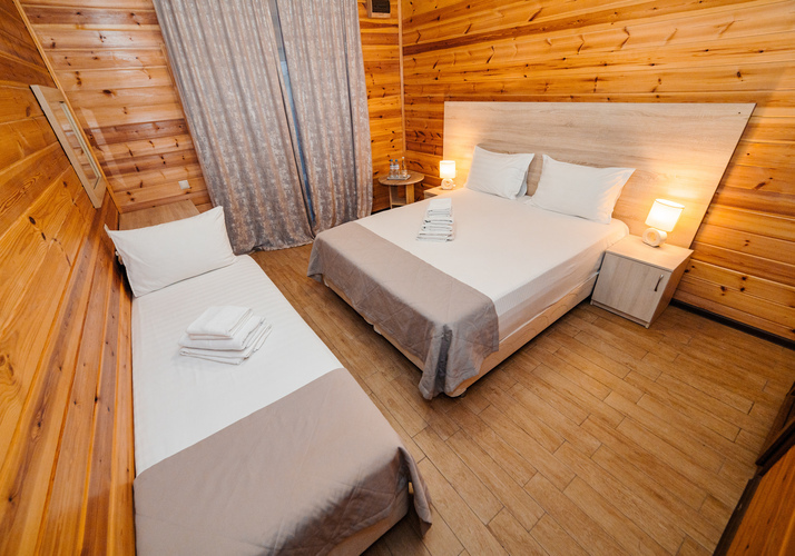 Уютные однокомнатные номера из экологически чистых материалов расположены на втором этаже эко-корпуса. Прекрасный вариант для трехместного размещения как для семьи, так и для небольшой дружной компании. Возможно размещение как на одной двуспальной и одной односпальной кровати, так и на трех односпальных кроватях. Номер оборудован всем необходимым для комфортного отдыха. В номере есть мини-холодильник, телевизор, кондиционер, Wi-Fi.В ванной комнате есть душ, унитаз, зеркало, фен, полотенца.