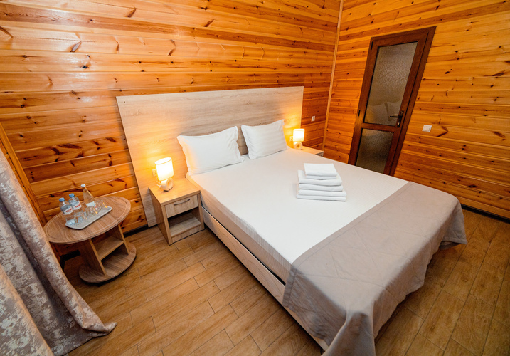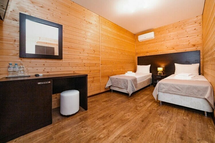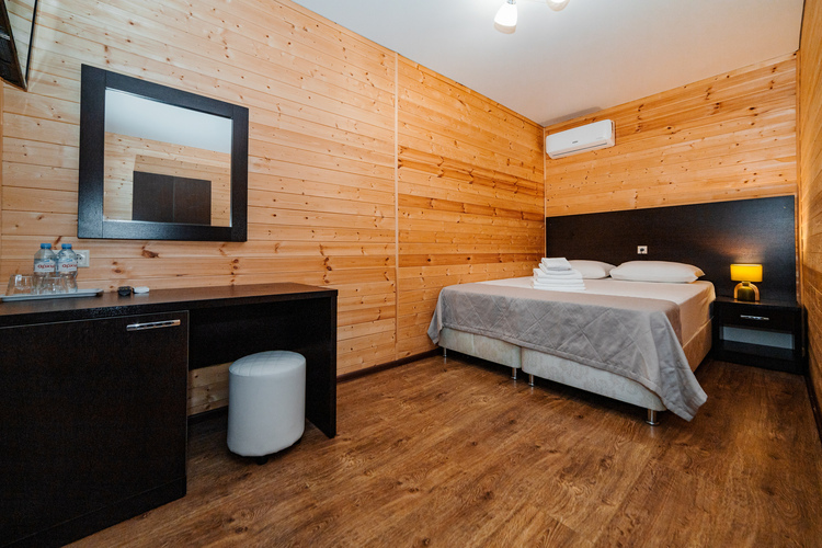 Уютные однокомнатные номера из экологически чистых материалов расположены на первом и втором этажах эко-корпуса, 15 кв. м. Отличный вариант для двухместного размещения. Возможно размещение как на одной двуспальной, так и на двух раздельных односпальных кроватях. Номер оборудован всем необходимым для комфортного отдыха. В номере есть мини-холодильник, телевизор, кондиционер, Wi-Fi. В ванной комнате есть душ, зеркало, фен, полотенца, туалетные и косметические принадлежности.