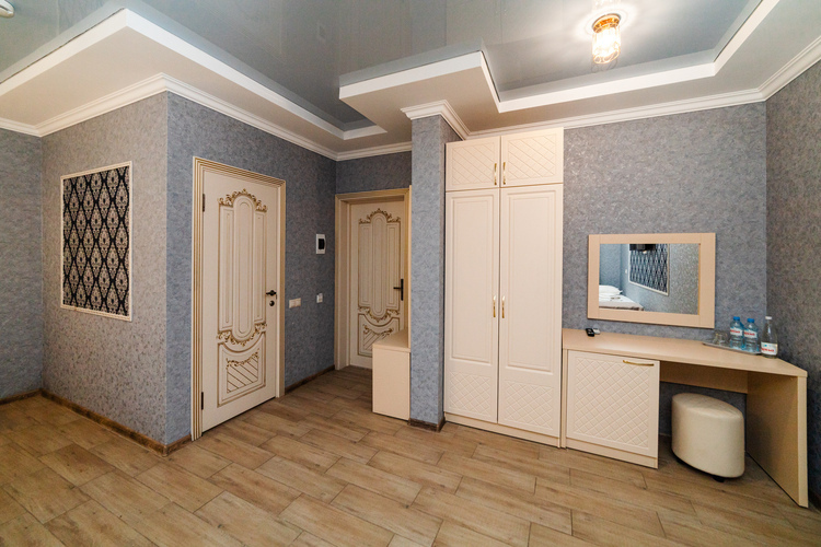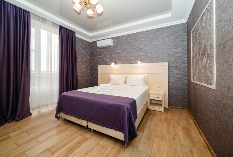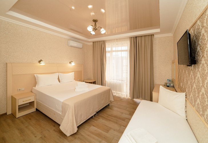 Просторные однокомнатные номера с современным интерьером расположены на втором, третьем и четвертом этажах основного корпуса. Номера оборудованы всем необходимым для комфортного и полноценного отдыха. Прекрасный вариант для четырехместного размещения как для семьи, так и для отдыха в кругу друзей. Номера оборудованы всем необходимым для комфортного отдыха. В номере есть мини-холодильник, телевизор, кондиционер, Wi-Fi. В ванной комнате есть душ, зеркало, фен, полотенца.