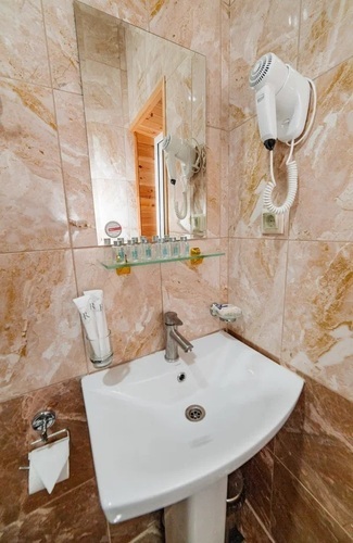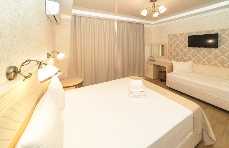 Уютные однокомнатные номера с современным дизайном расположены на втором, третьем и четвертом этажах основного корпуса. Возможно размещение как на одной двуспальной, так и на трех односпальных кроватях. Номера оборудованы всем необходимым для полноценного и комфортного отдыха. В номере есть мини-холодильник, телевизор, кондиционер, Wi-Fi. В ванной комнате есть душ, зеркало, фен, полотенца, туалетные и косметические принадлежности.