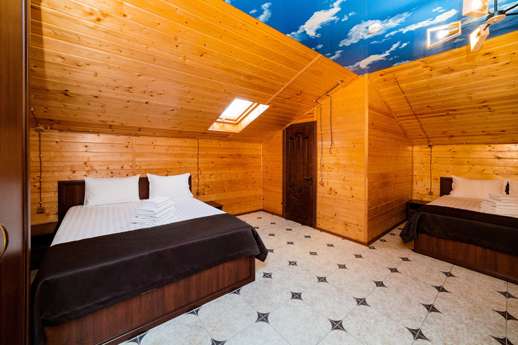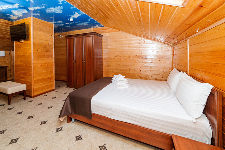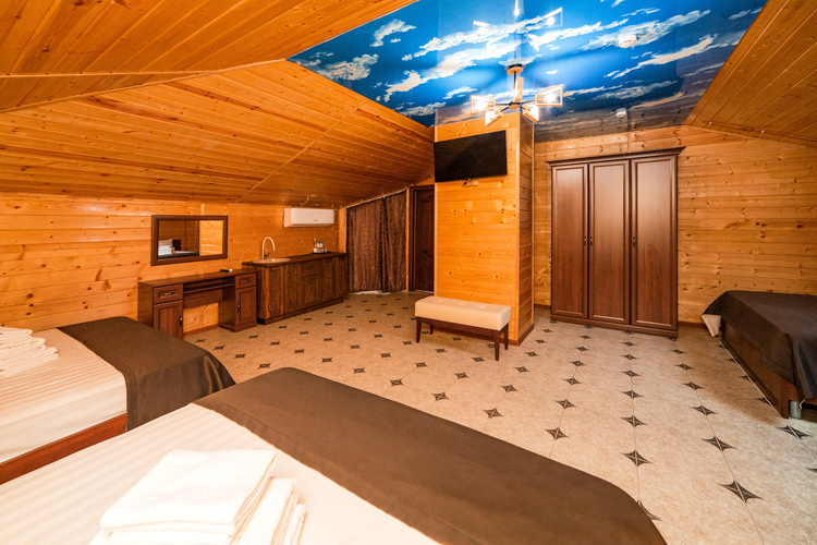 Уютный просторный однокомнатный номер из экологически чистого дерева (сосны) с мансардой расположен на пятом этаже основного корпуса. Номер оборудован всем необходимым для полноценного и комфортного отдыха. В номере находятся три двуспальные кровати. Отличный вариант для шестиместного размещения как для большой семьи, так и большой дружной компании. Номер оборудован всем необходимым для комфортного отдыха. В номере есть холодильник, телевизор, кондиционер, Wi-Fi.