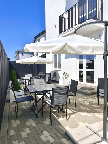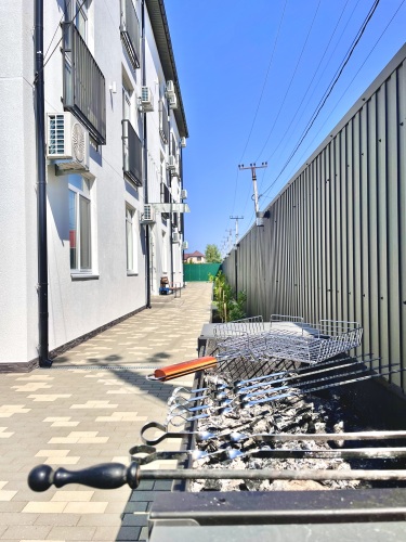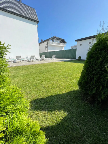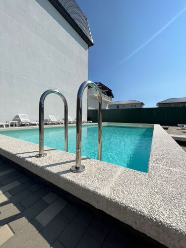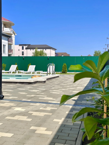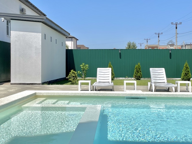 Во дворе есть взрослый и детский бассейны с подогревом, шезлонгами и зоной отдыха, а также детская площадка и мангальная зона.