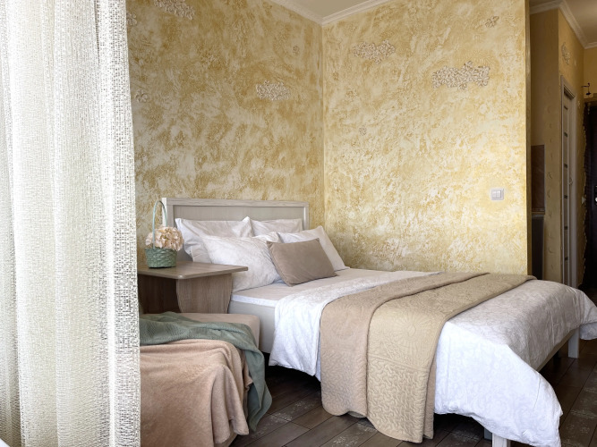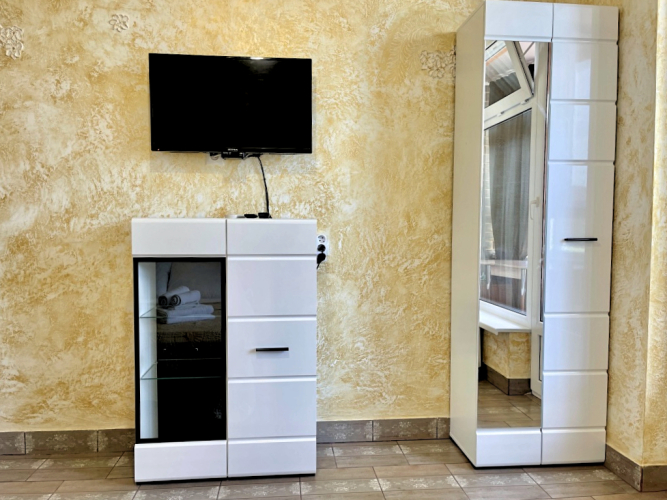 Чтобы вы могли отдохнуть после долгого дня, в номере есть телевизор и халат. Оснащение зависит от выбранной категории номера.