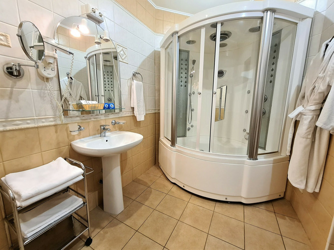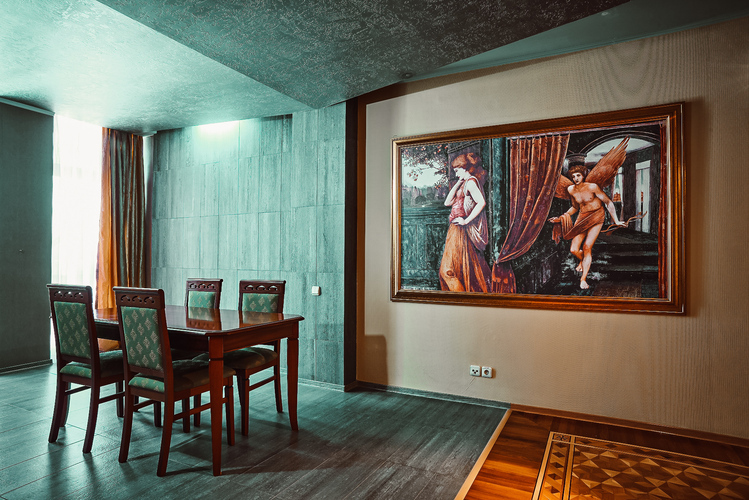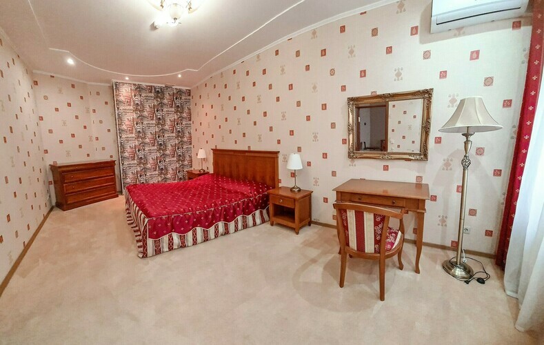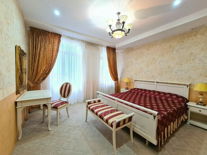 Номера, символизирующие роскошь и изысканность. Просторный трехкомнатный номер выдержан в классическом стиле. К вашим услугам 109 квадратных метров, обставленных качественной итальянской мебелью.