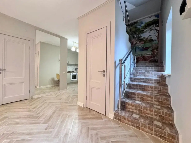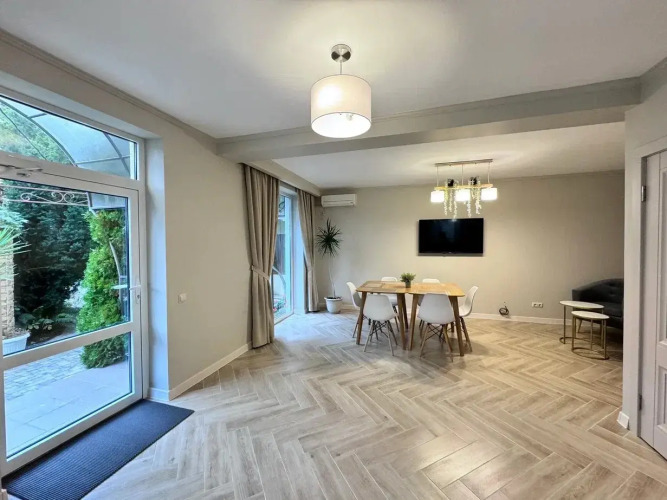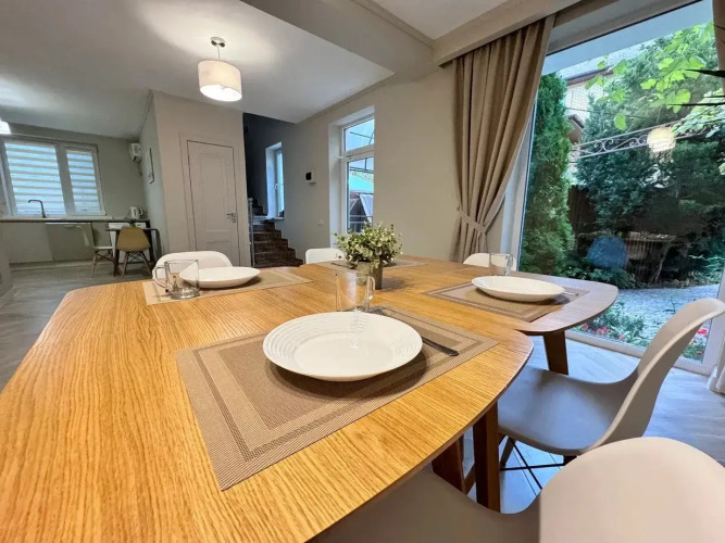 В гостевом доме есть общая кухня и гостиная с обеденной зоной занимающие первый этаж. Общая кухня оборудована. В кухне установлены стиральная и посудомоечные машины.