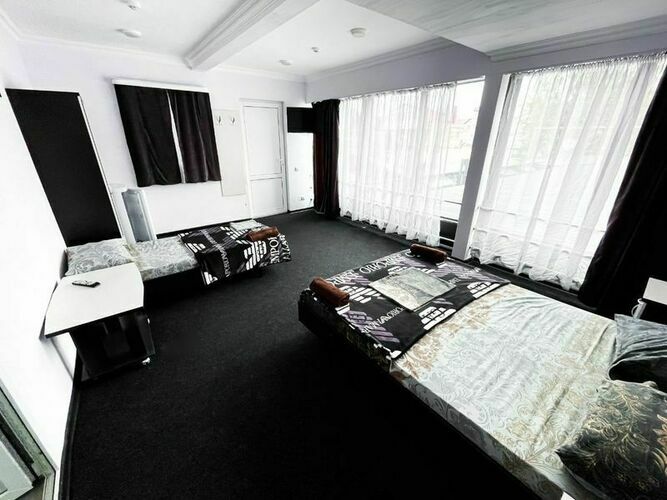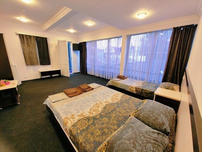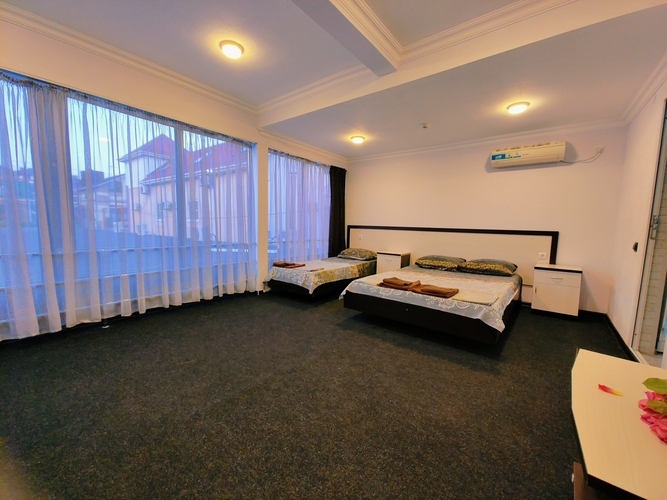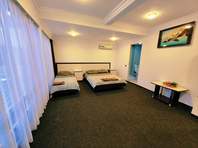 Светлый просторный Четырехместный номер с панорамными окнами + окно на крытый двор Номер оснащен: двуспальная кровать и две односпальные кровати, шкаф, кондиционер, прикроватные тумбочки, журнальный столик, зеркало, телевизор, мини холодильник, сан узел