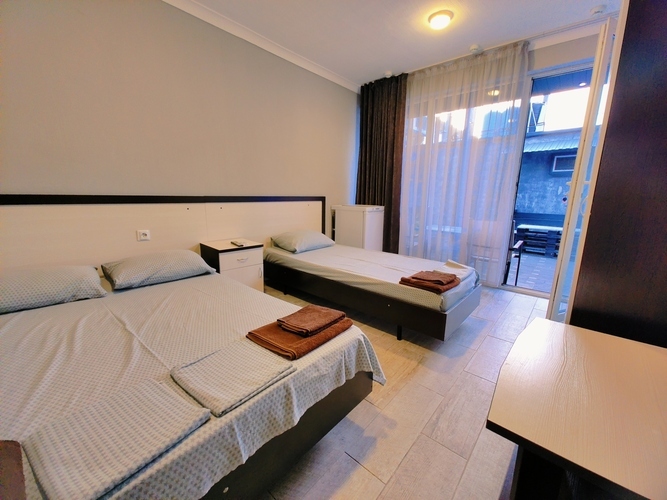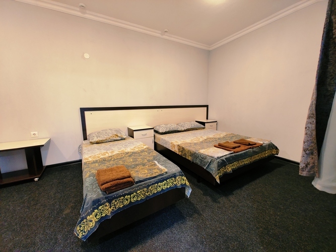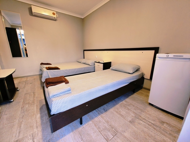 Трехместный номер с окном на крытый двор Номер оснащен: двуспальная кровать и односпальная кровать, шкаф, кондиционер, прикроватные тумбочки, журнальный столик, зеркало, телевизор, мини холодильник, сан узел