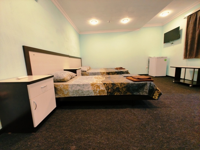 Четырехместный номер с окном на крытый двор Номер оснащен: двуспальная кровать и две односпальные кровати, шкаф, кондиционер, прикроватные тумбочки, журнальный столик, зеркало, телевизор, мини холодильник, сан узел