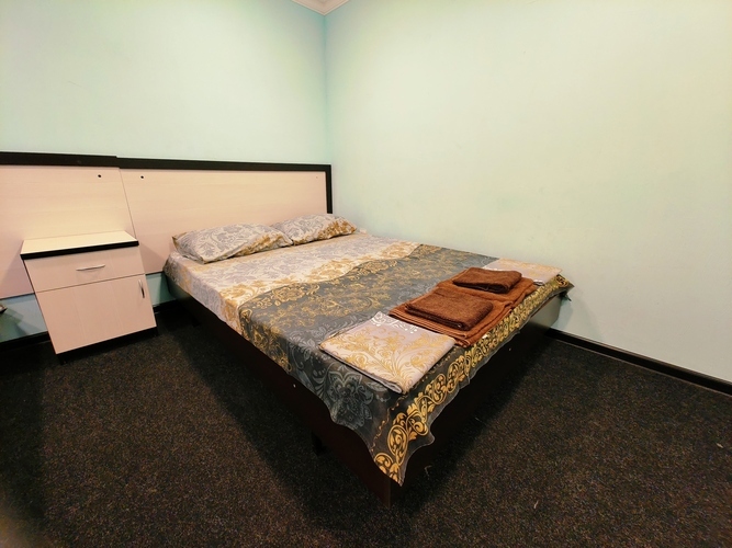Двуместный номер с окном на крытый двор Номер оснащен: двуспальная кровать, шкаф, кондиционер, прикроватные тумбочки, журнальный столик, зеркало, телевизор, мини холодильник, сан узел