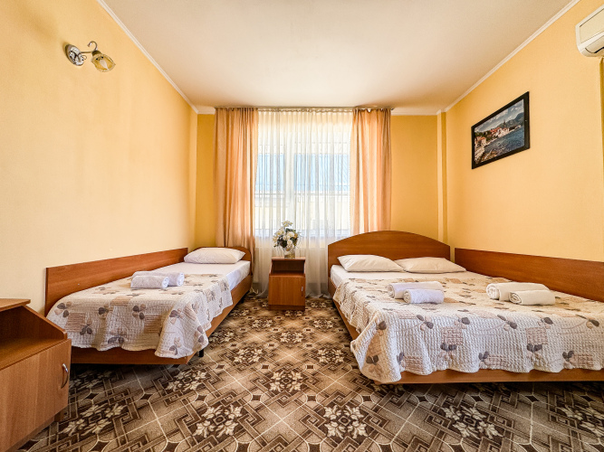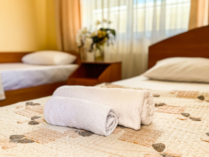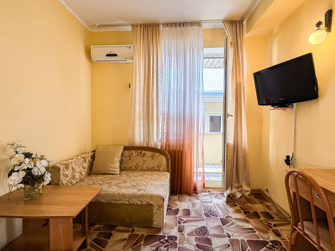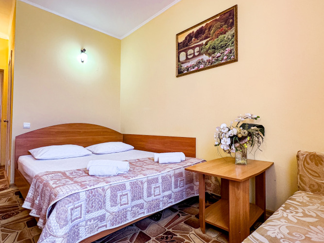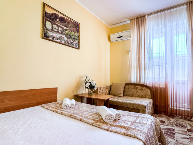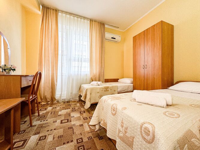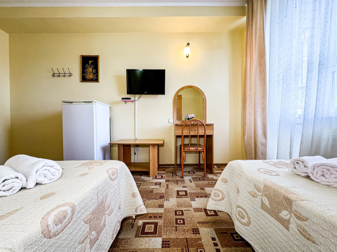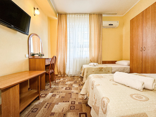Номер уютно обставлен и оснащён необходимым, чтобы отдохнуть после долгого и насыщенного дня. Имеются телевизор. Оснащение зависит от выбранной категории номера.