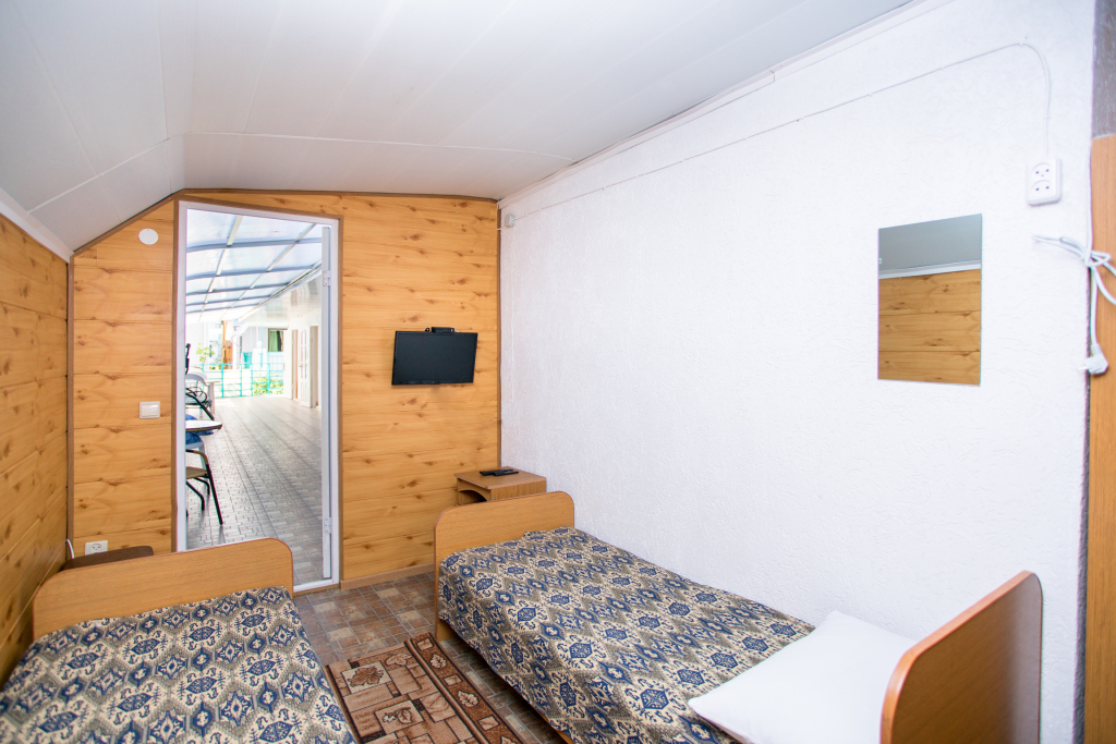 Каждый номер с двумя спальными местами, кондиционером, телевизором и необходимой мебелью.