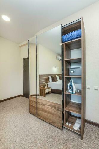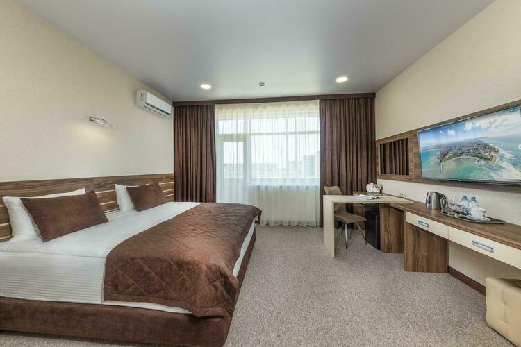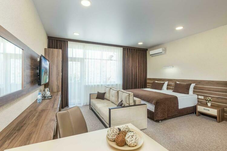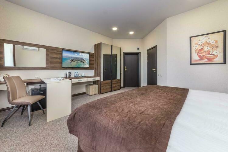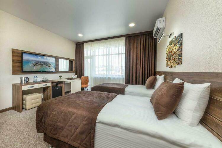 Просторный и уютный номер подходит для размещения двоих человек Отличается повышенным комфортом и удобством,так же в номере представлена кровать размера «King-size».Все номера выполнены в соответствии с современными тенденциями:шторы блэкаут,две односпальные кровати, телевизор,вместительный шкаф с зеркалом в пол,личный балкон с мебелью,мини-бар,питьевая бутилированная вода, чайная станция,индивидуальная система кондиционирования, вентиляции,гладильная доска,утюг,система подогрева,набор косметики
