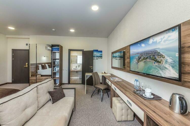 Номера высшей категории. Общей площадью 32 кв.м. Просторный и уютный номер удобен для размещения 2 человек на основных местах и еще 2–на дополнительных. Уютный интерьер позволит чувствовать себя в нем максимально комфортно. Все номера выполнены в соответствии с современными тенденциями: шторы блэкаут,телевизор, вместительный шкаф с зеркалом в пол,личный балкон с мебелью,мини-бар,питьевая бутилированная вода,чайная станция, индивидуальная система кондиционирования и вентиляции, набор косметики.