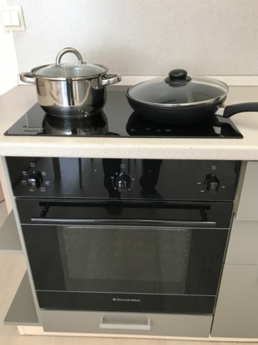 На кухне имеется: мебель, наборы посуды, холодильник, индукционная плита, духовка, микроволновая печь, стиральная машина, кондиционер, раздвижной диванчик. Санузел оснащен современной сантехникой. Холодная и горячая вода постоянно.