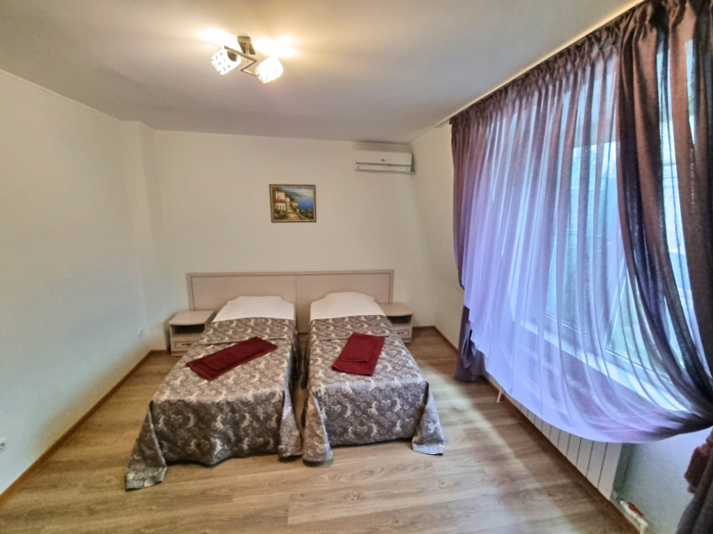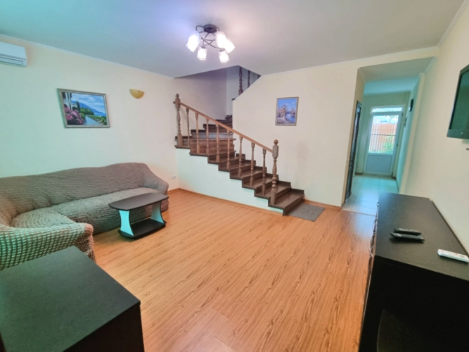 В двух спальнях и гостиной есть шесть основных спальных мест, а также одно дополнительное место на кресло-кровати. Имеется детская кроватка. В доме два санузла, душевая кабина и душ на улице с горячей водой. В каждой комнате есть телевизор и сплит-система. В доме подключён Wi-Fi. В распоряжении гостей: стиральная машина-автомат, утюг, гладильная доска, фен.
