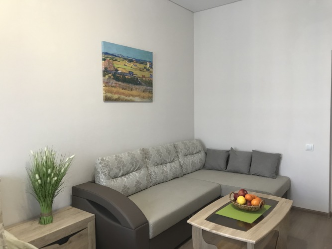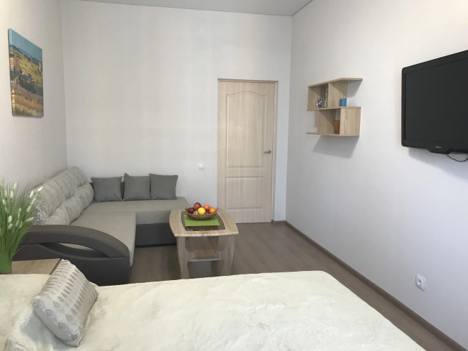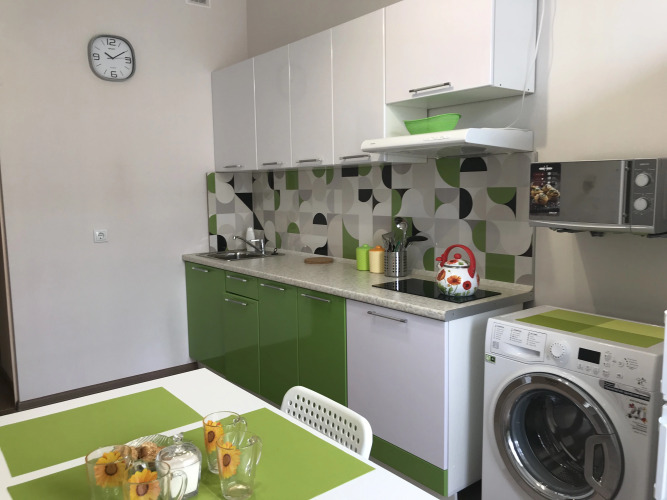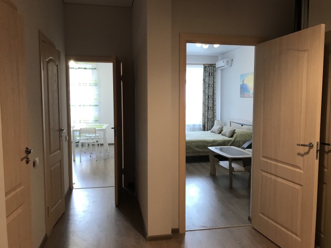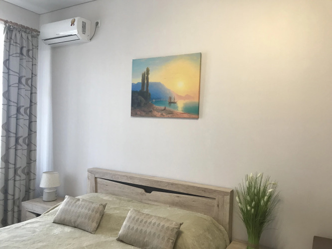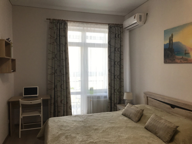 Апартаменты являются однокомнатными и расположены на 12 этаже. Для гостей доступны: двуспальная кровать размером 160 см с матрасом и подушками, раздвижной диван с подушками, тумбы, журнальный и компьютерный столы, кондиционер, выход на балкон, кухонная мебель, холодильник, индукционная плита, микроволновая печь, стиральная машина, кондиционер, набор посуды, большой зеркальный раздвижной шкаф для хранения одежды, пылесос, гладильная доска, сушилка для белья. Рядом с апартаментами имеется кладовая комната для хранения крупногабаритных вещей. Санузел и ванная комната представлены раздельно. Из окон и балкона открывается вид на море и побережье. Возле дома имеется парковка. Прилегающая территория к дому огорожена, благоустроена, имеется шлагбаум. Предоставляется встреча гостей на любом вокзале.