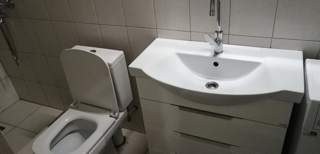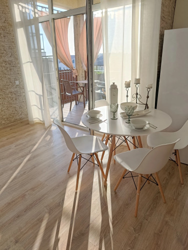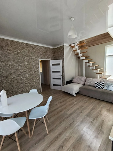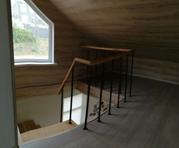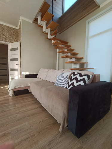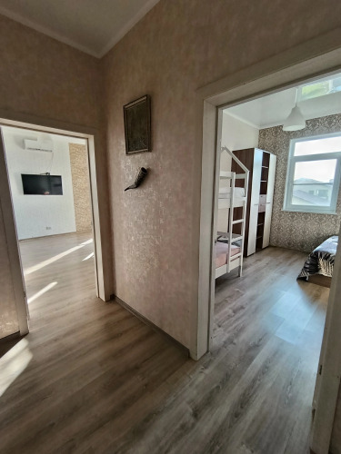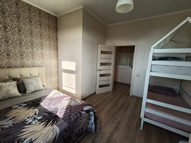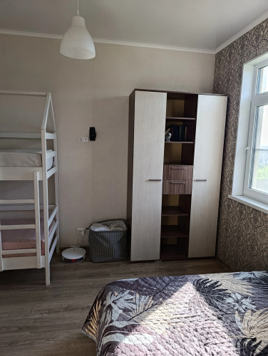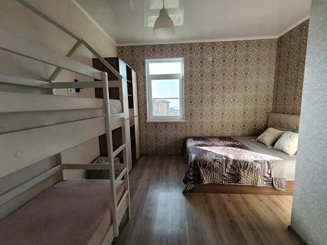 На первом этаже расположены: кухня-гостиная с диваном и выходом на террасу, спальня с двуспальной кроватью и двухъярусной детской кроватью, санузел. На втором: спальня с двуспальной кроватью.