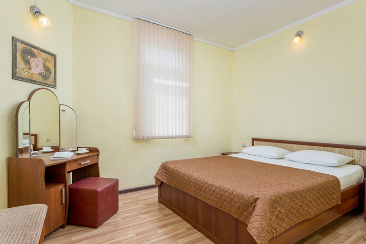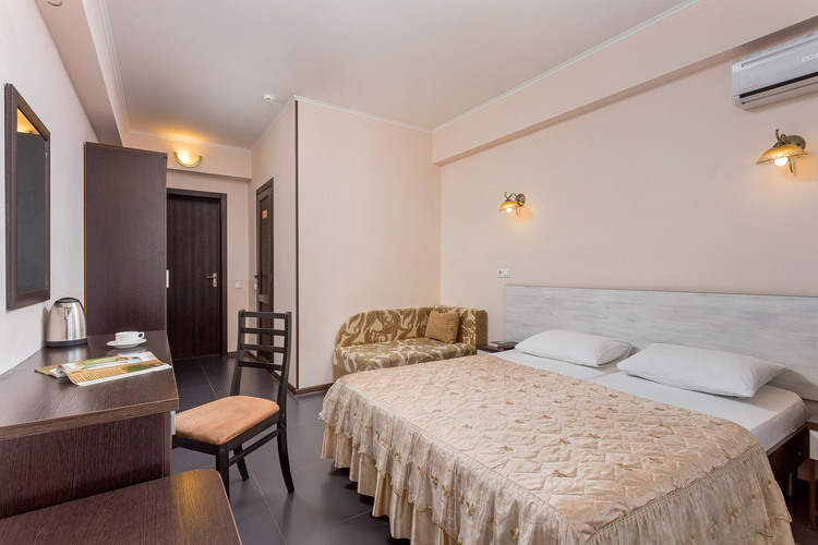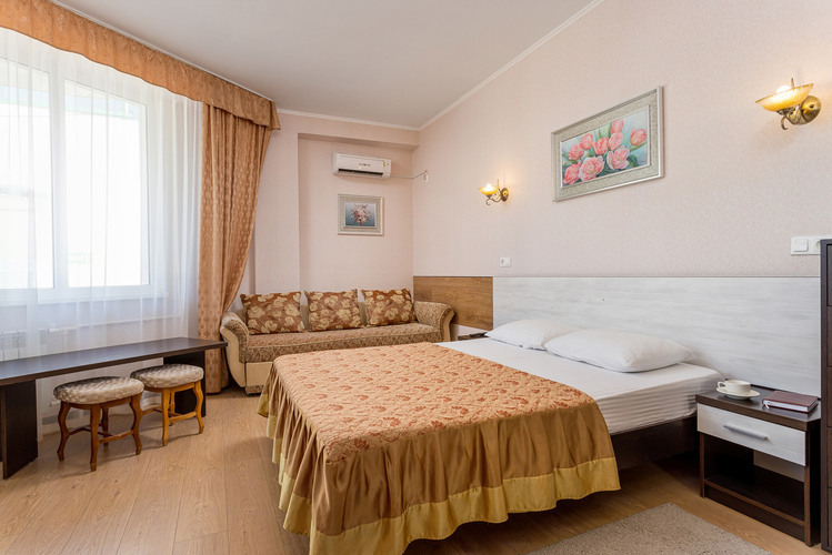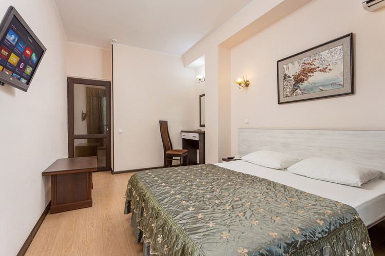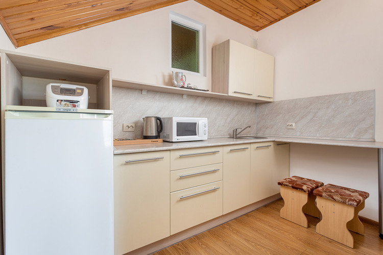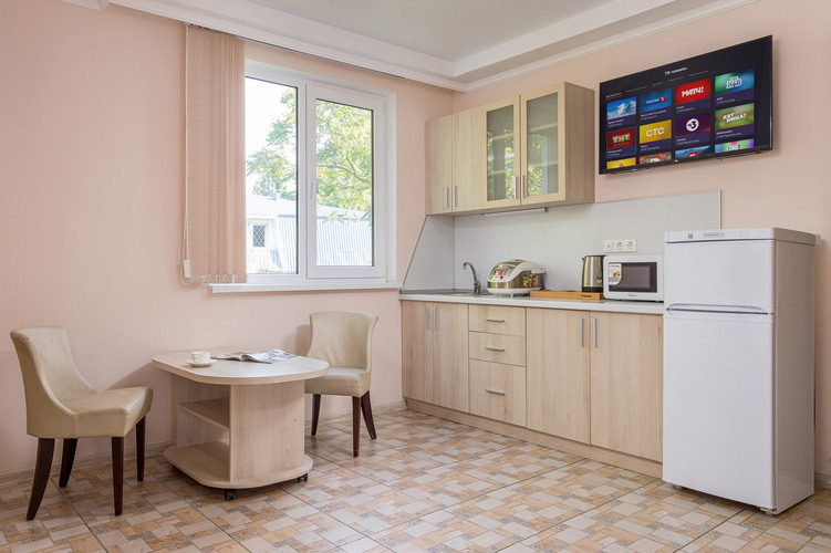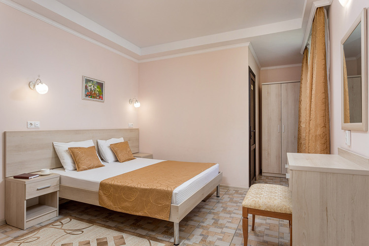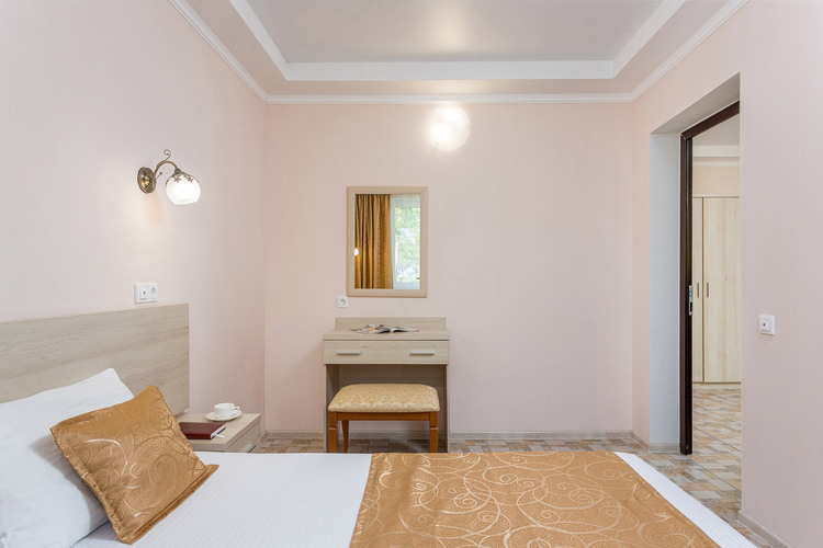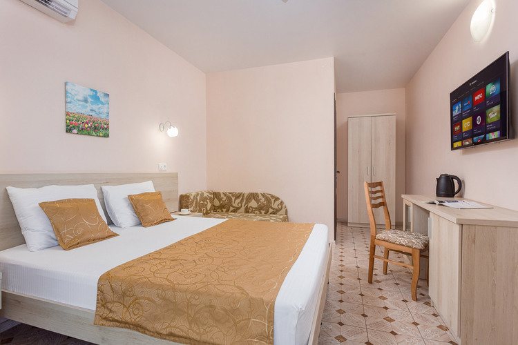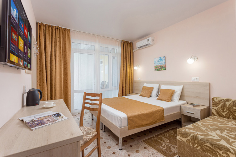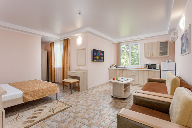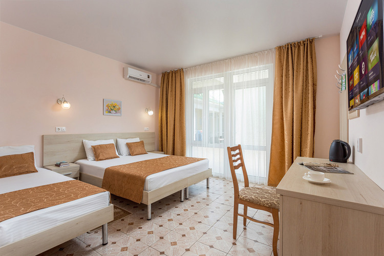 1 комната, санузел+душ. Номер без балкона. Есть общая терраса для отдыха. Мебель: двуспальная кровать или две односпальные кровати, стулья, шкаф, журнальный столик, прикроватные тумбочки, вешалки, зеркало. Удобства: холодильник, жк-телевизор, сплит-система, электрический чайник, посуда, сушка для белья.