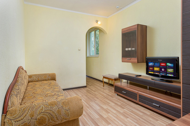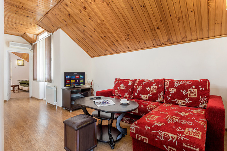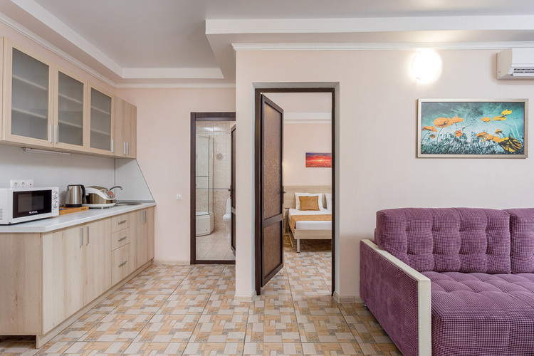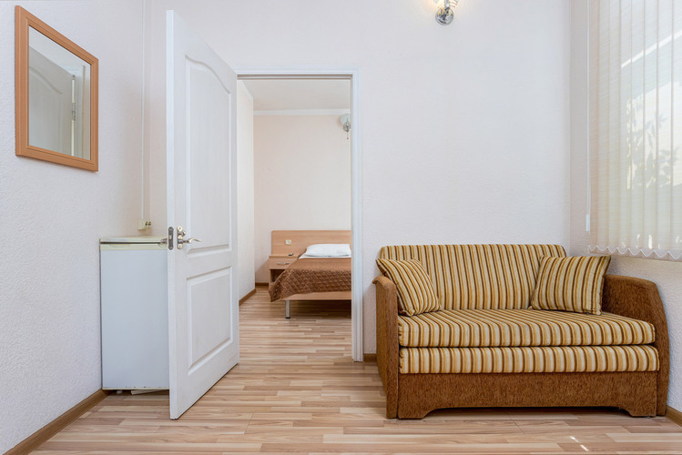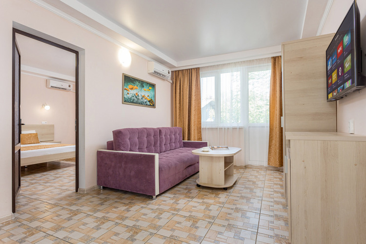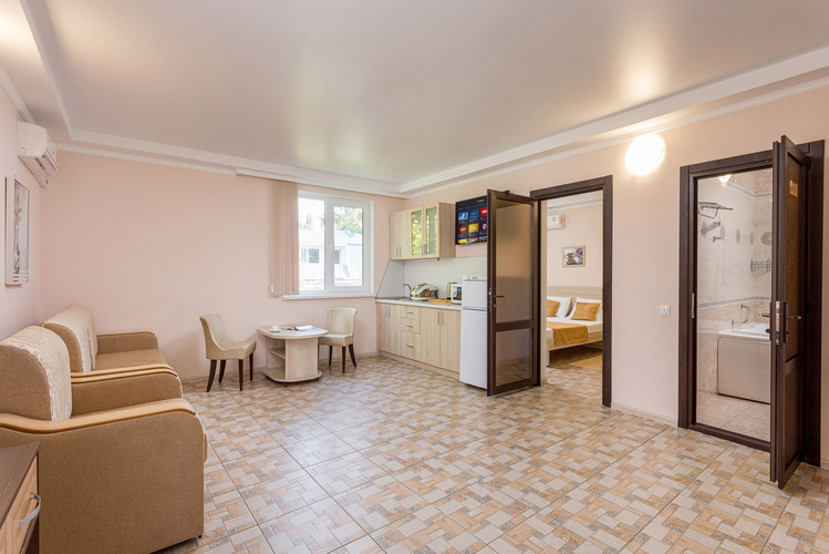 2 комнаты, санузел+душ. Номер без балкона. Есть общая терраса для отдыха. Мебель: двуспальная кровать или 2 односпальные, диван-кровать, шкаф, журнальный столик, прикроватные тумбочки, вешалки, зеркало. Удобства: холодильник, жк-телевизор, сплит-система, электрический чайник, посуда, сушка для белья.