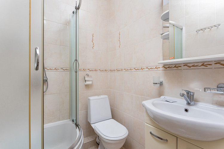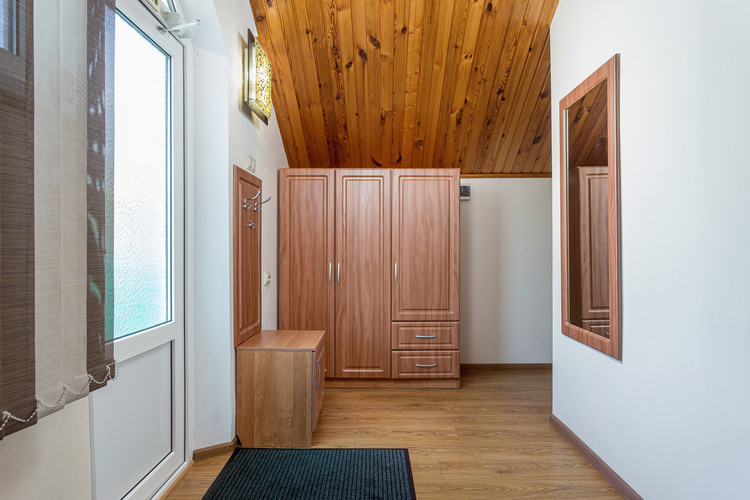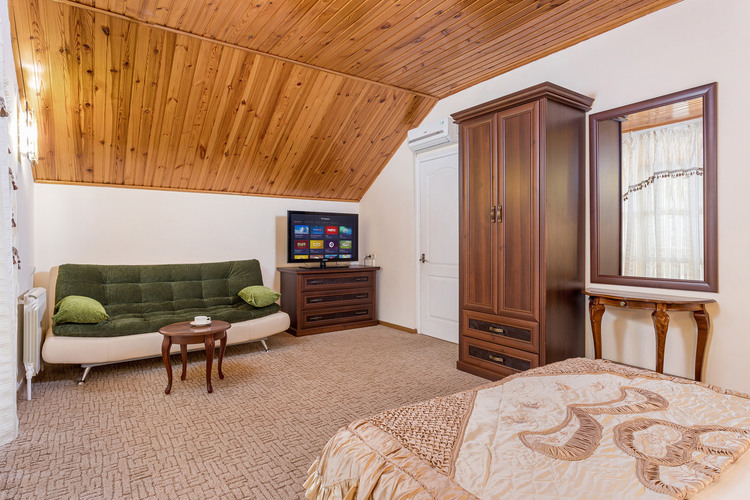 1 комната, санузел+душ. Мансардный этаж. Номер без балкона, но с общей террасой для отдыха. Мебель: двуспальная или две односпальные кровати, кресло-кровать, стулья, шкаф, журнальный столик, стол, прикроватные тумбочки, вешалка, зеркало. Удобства: холодильник, жк-телевизор, сплит-система, электрический чайник, посуда, сушка для белья.