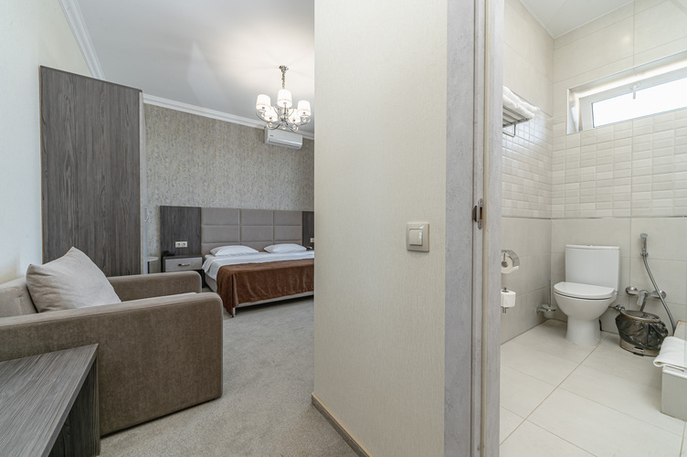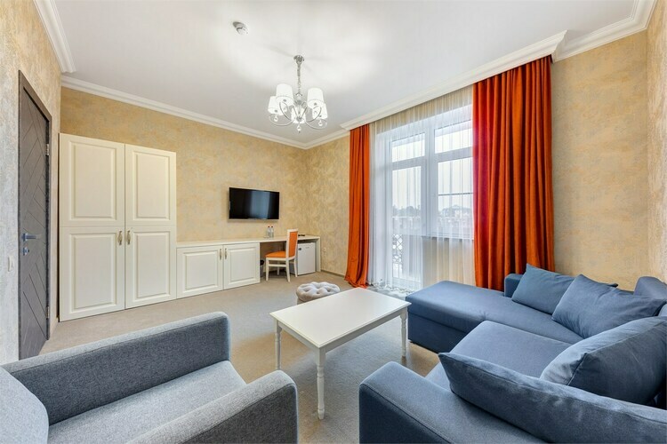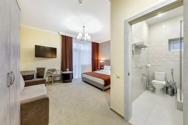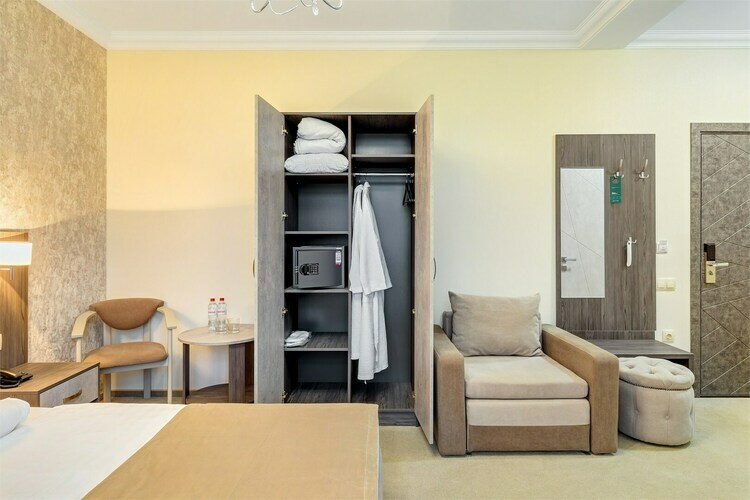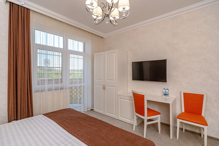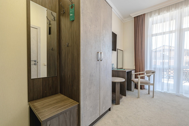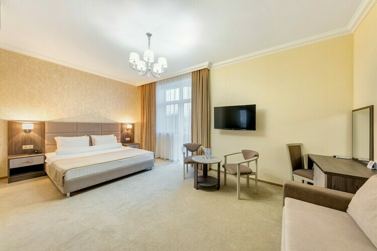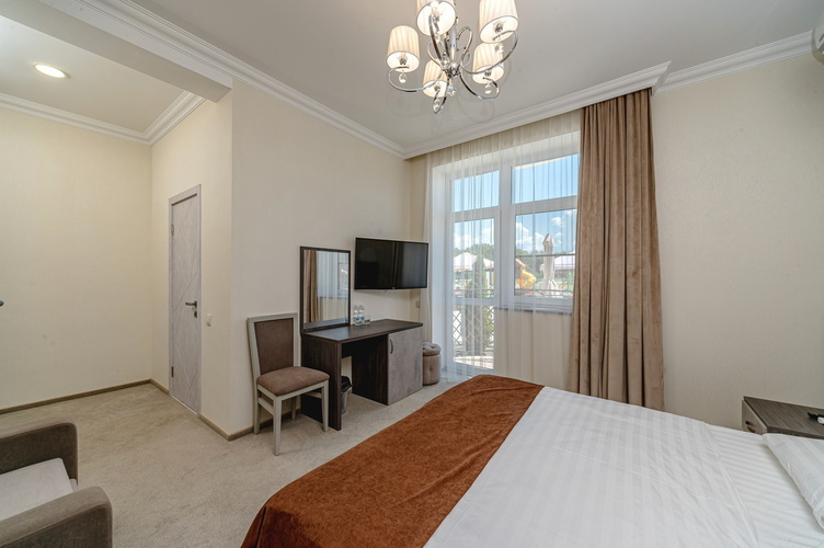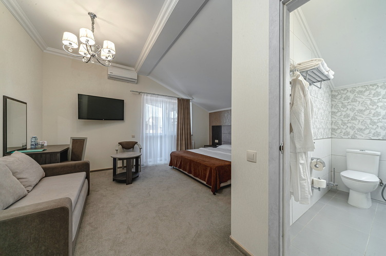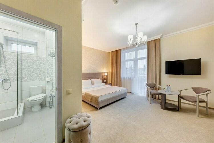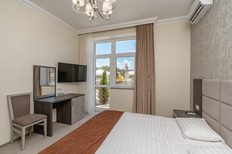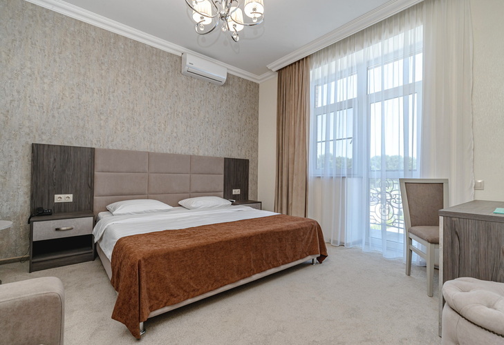 В номере: двуспальная кровать размером king-size, кресло-кровать 70*190см в разложеном виде), прикроватные тумбочки, туалетный столик, зеркало, шкаф, вешалка, сейф, телевизор со Smart TV, кондиционер, мини-холодильник, чайная станция. Ванная комната: душевая кабина, зеркало, зеркало косметическое, фен, комплект полотенец, халаты, тапочки, набор гостиничной косметики. Французский балкон с видом на парк отеля, сушилка для белья.