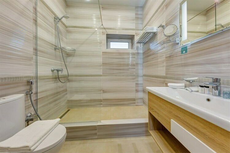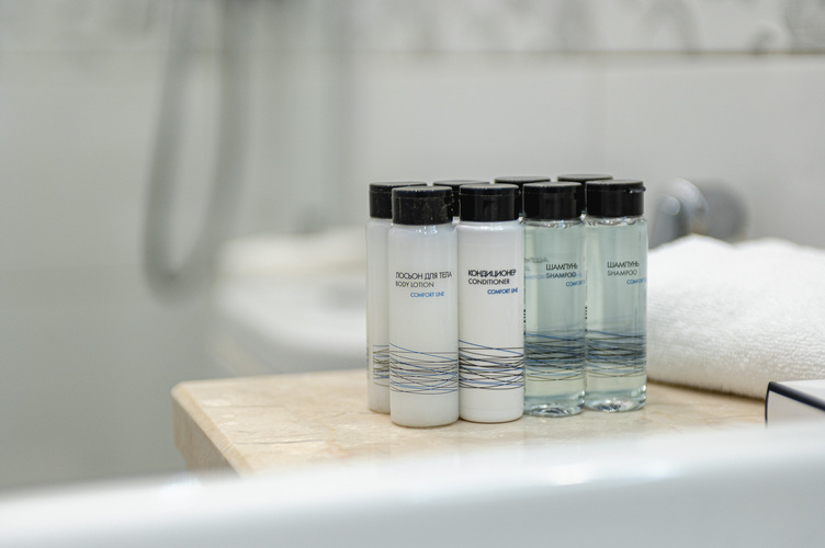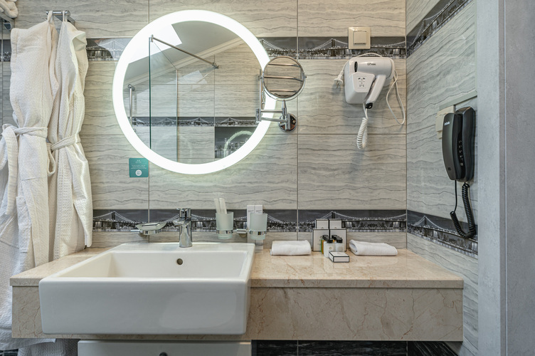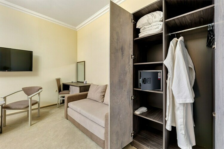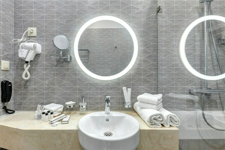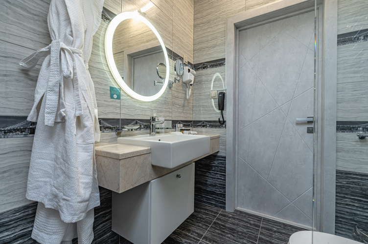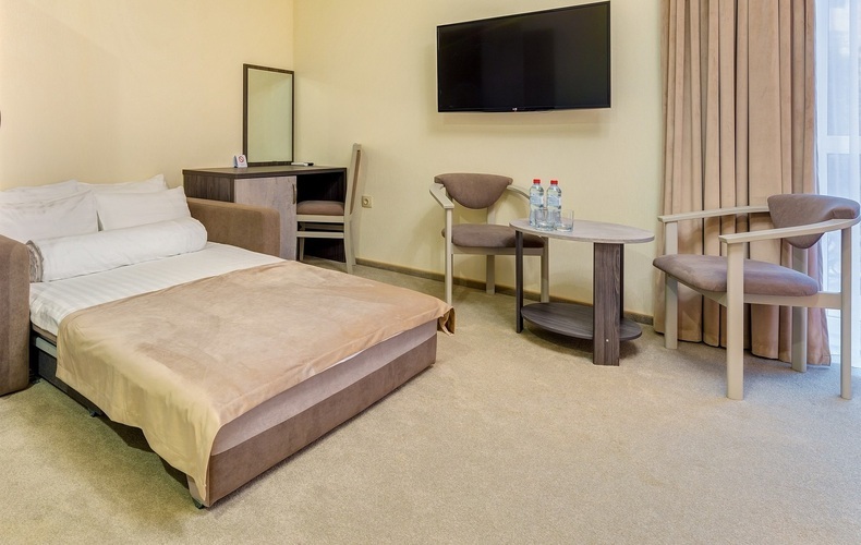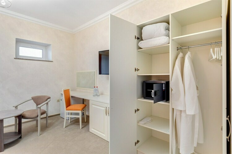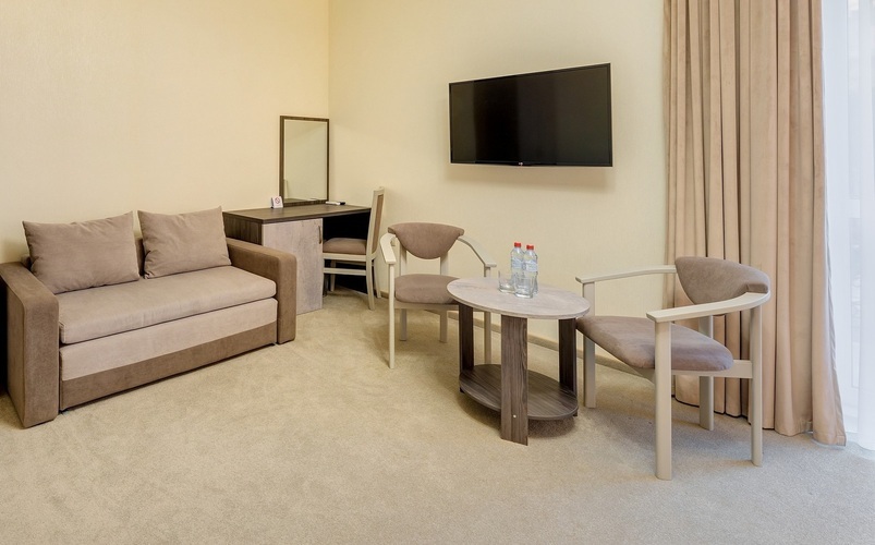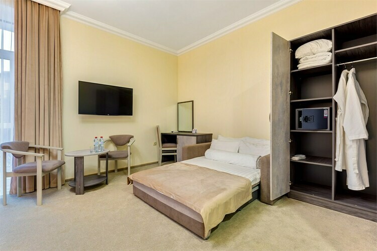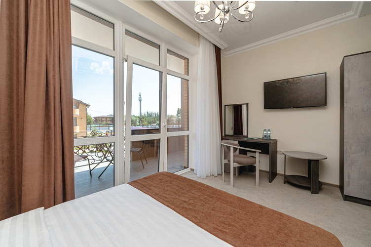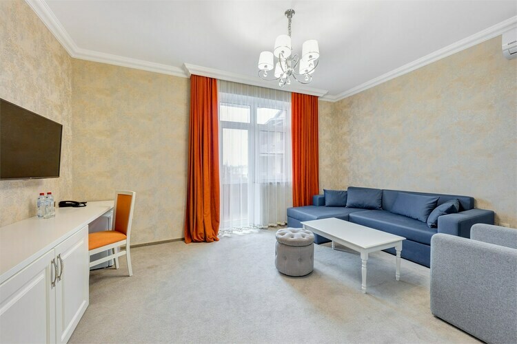 В номере: двуспальная кровать размером king-size, кресло-кровать 70*190см в разложеном виде), прикроватные тумбочки, туалетный столик, зеркало, шкаф, вешалка, сейф, телевизор со Smart TV, кондиционер, мини-холодильник, чайная станция. Ванная комната: душевая кабина, зеркало, зеркало косметическое, фен, комплект полотенец, халаты, тапочки, набор гостиничной косметики. Французский балкон с видом на парк отеля, сушилка для белья.