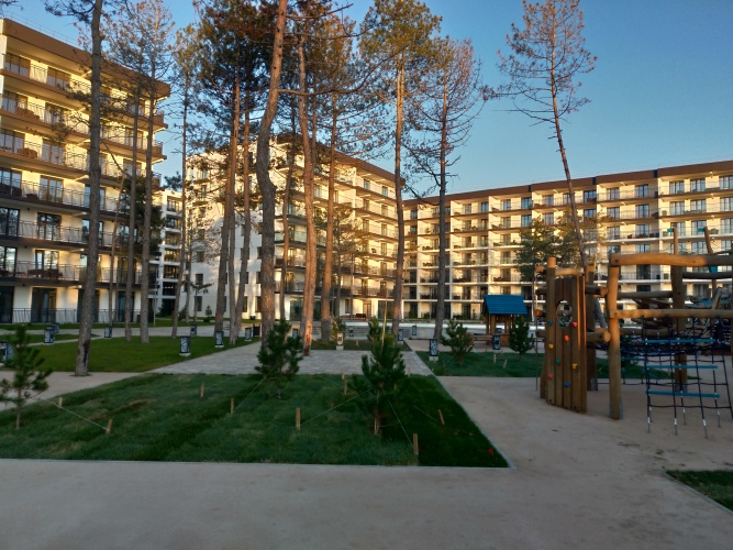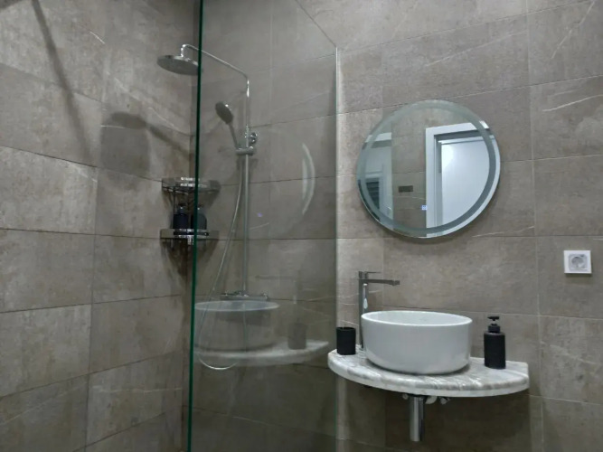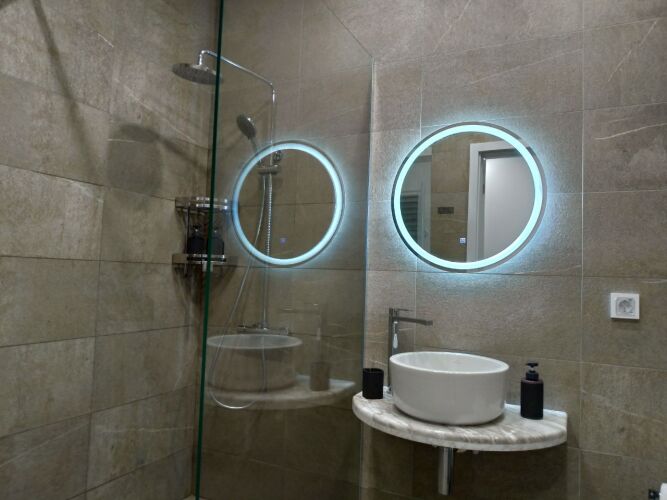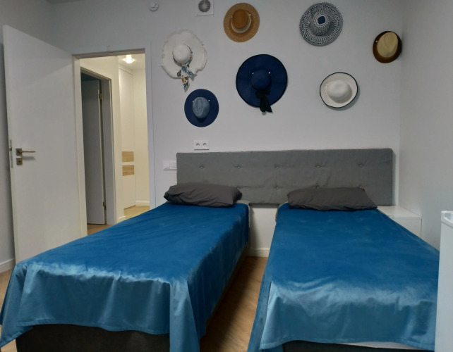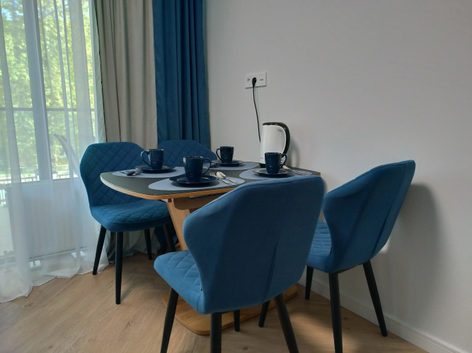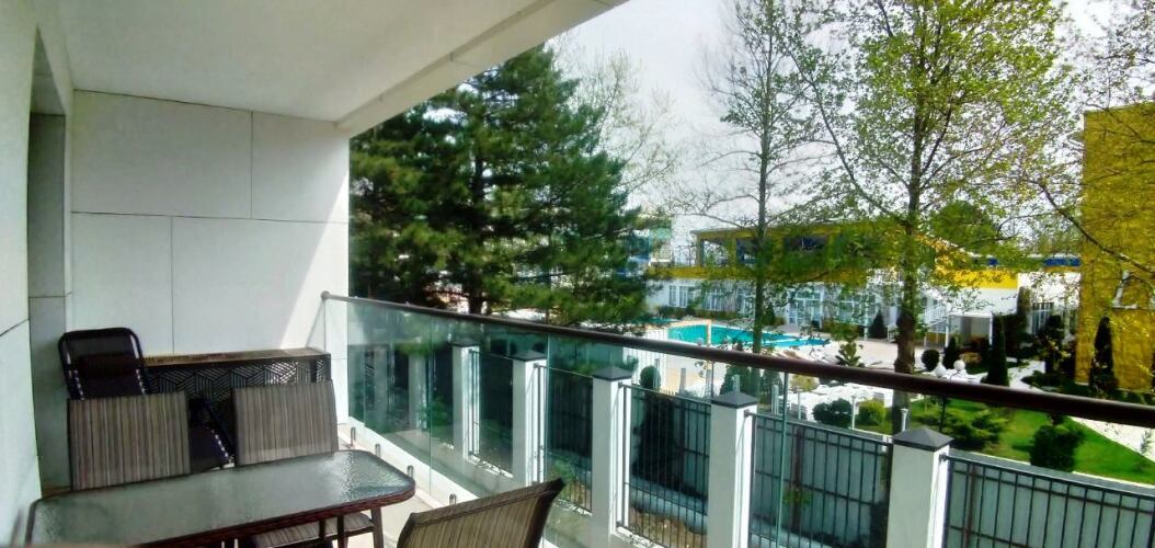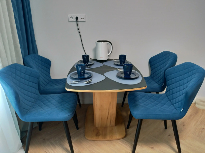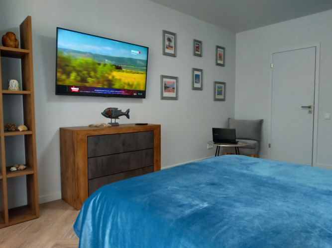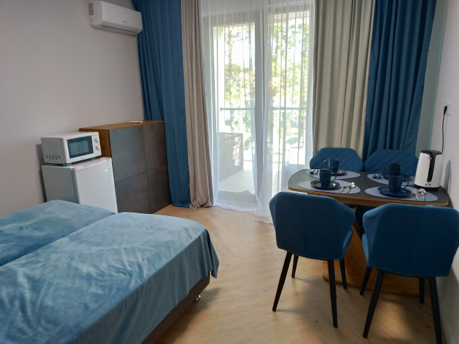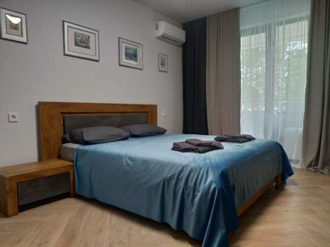 В апартаментах: две спальных комнаты с кроватями и ортопедическими матрасами (возможно размещение до 4 гостей), комоды, встроенный шкаф, обеденная зона, холодильник, микроволновая печь, электрический чайник, стиральная машина, утюг, гладильная доска, фен, полотенца, средства гигиены, телевизор smart TV, Wi-Fi, санузел, панорамные окна с напылением серебра, терраса 15 кв. м. с шезлонгом. В каждой комнате установлен кондиционер.