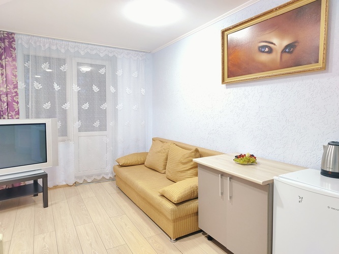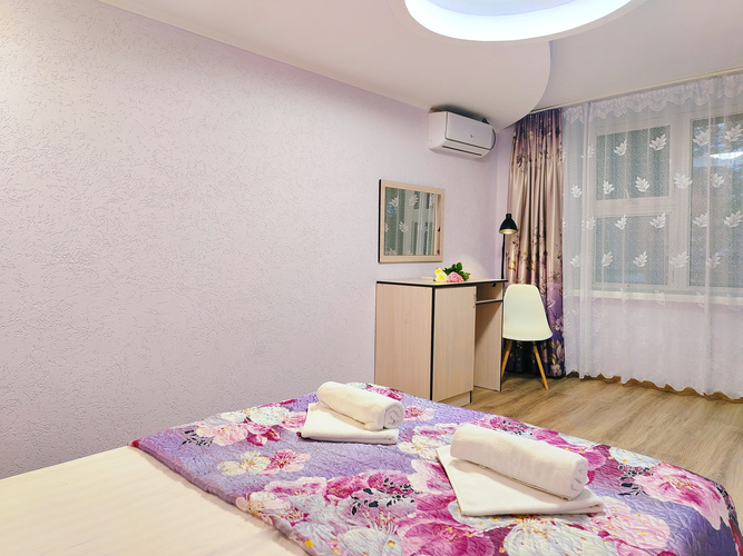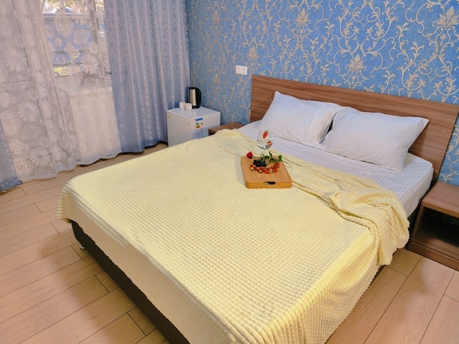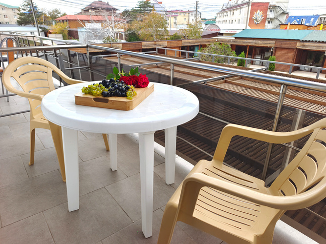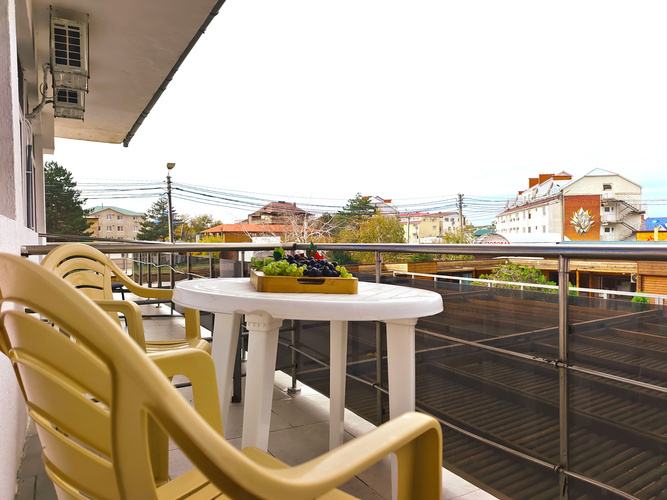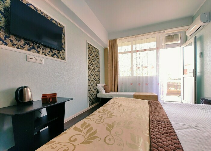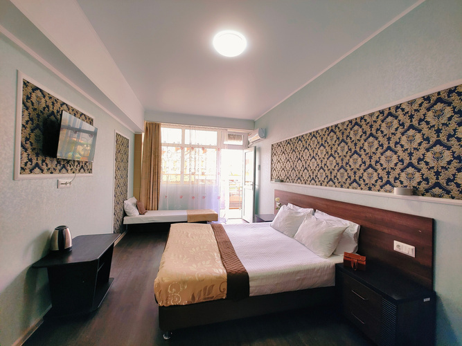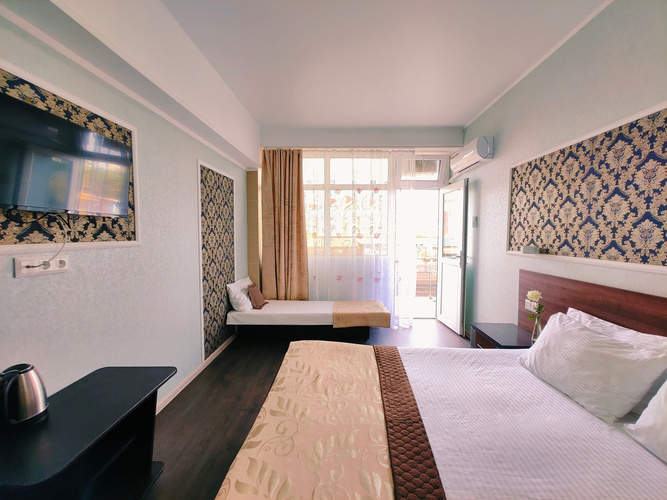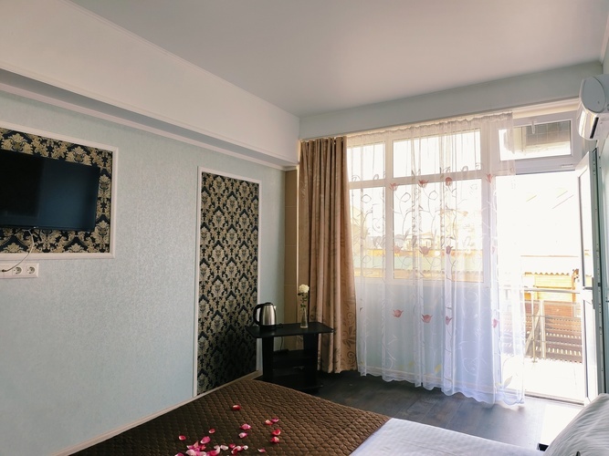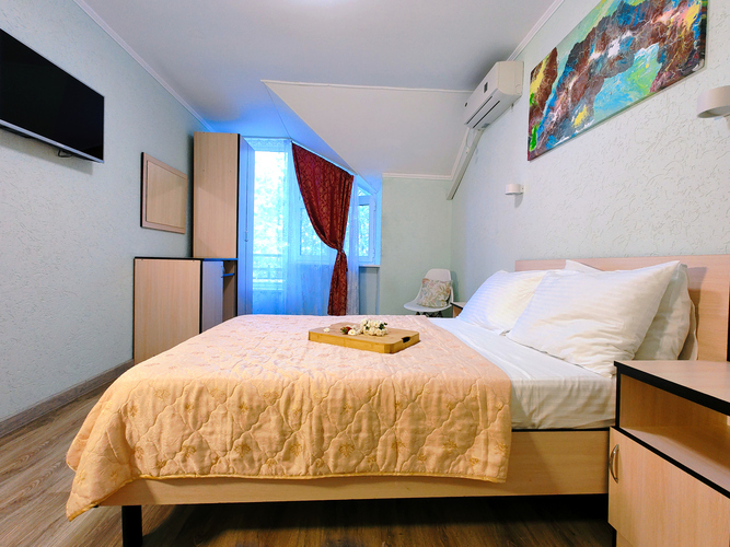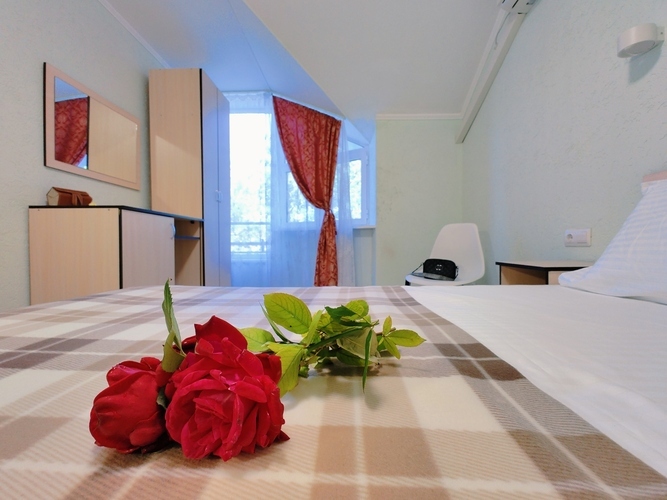 Уютный 2-х местный номер с балконом. В номере В номере: 2х спальная кровать, прикроватные тумбочки или журнальный столик, шкаф для одежды, ЖК-телевизор, сплит-система, мини-холодильник, электрочайник . Ванная комната: душевая, раковина, унитаз, набор полотенец, набор одноразовой косметики. Балкон: летняя мебель.