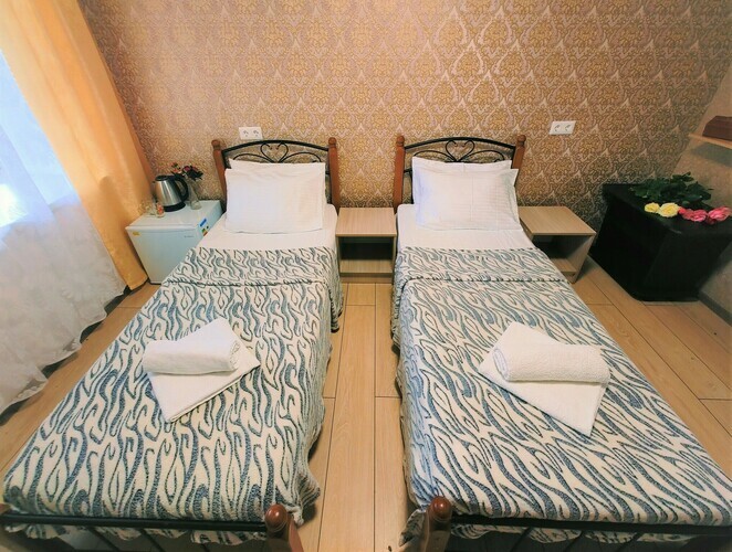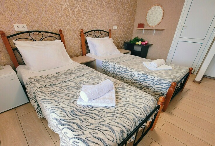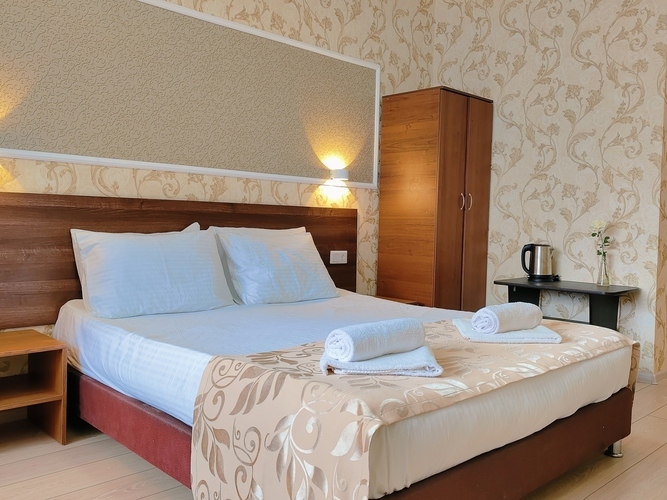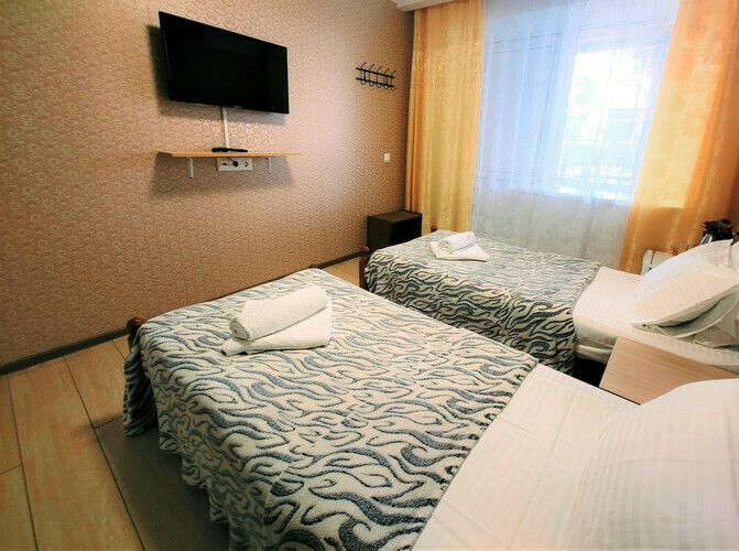 Комфортный 2-х местный номер без балкона. В номере: 2х спальная кровать, прикроватные тумбочки или журнальный столик, шкаф для одежды, ЖК-телевизор, сплит-система, мини-холодильник, электрочайник . Ванная комната: душевая, раковина, унитаз, набор полотенец, набор одноразовой косметики.