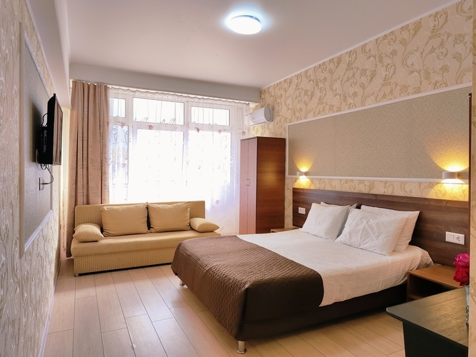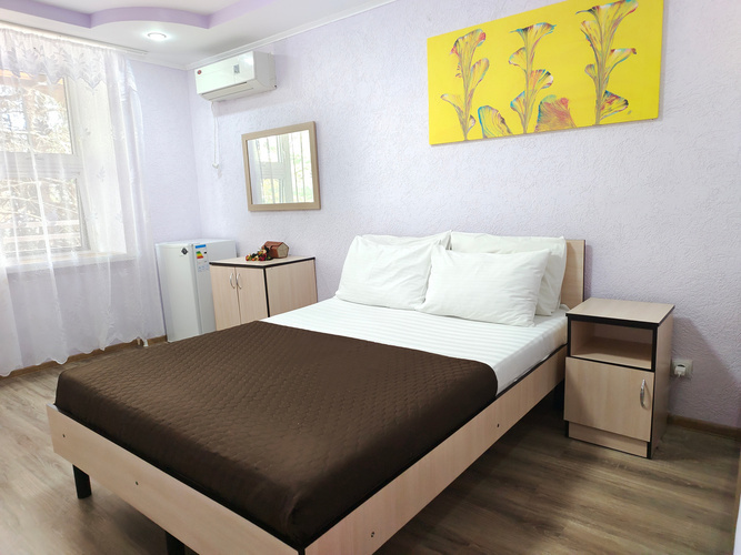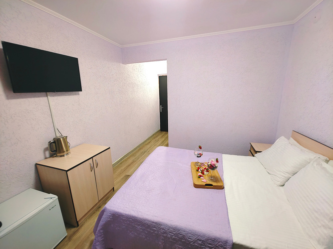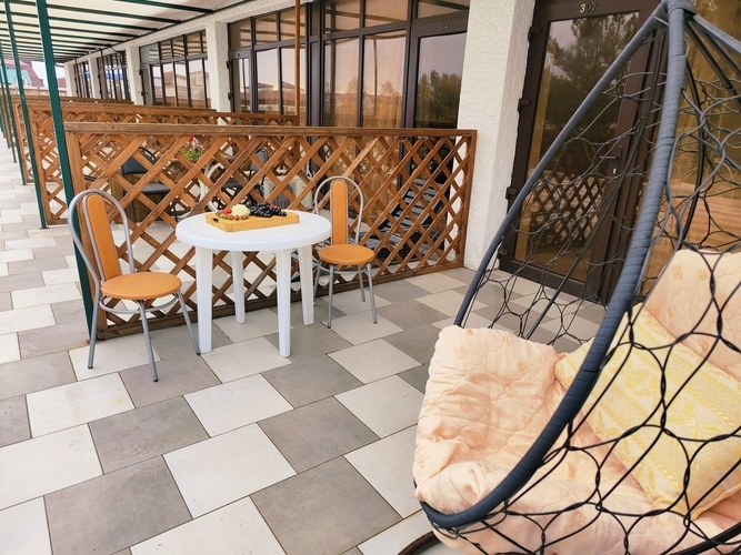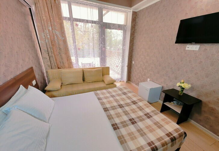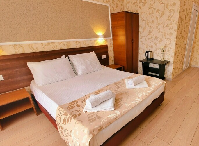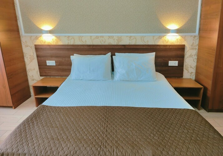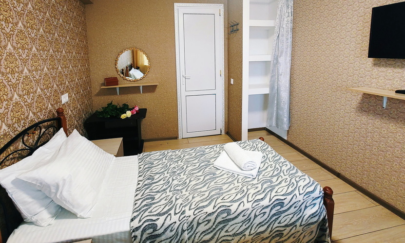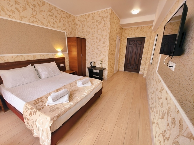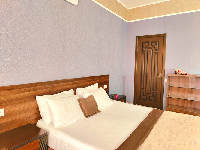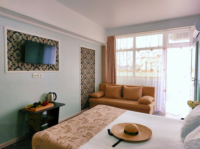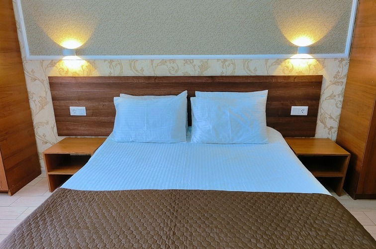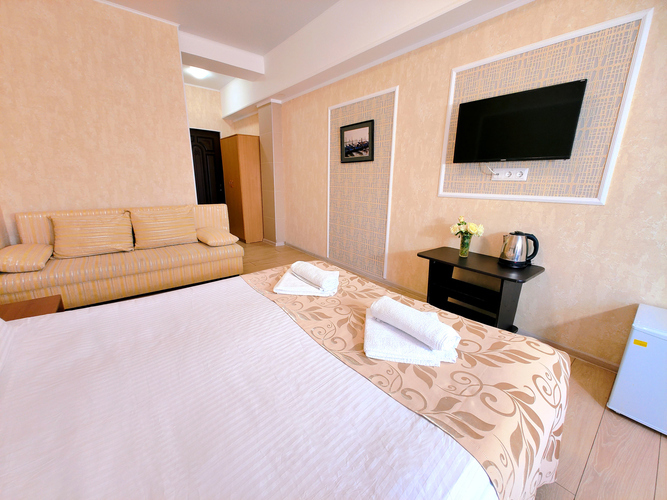 Комфортный 2-х местный номер категории полулюкс с террасой. Номер оснащен всем необходимым для вашего отдыха: 2-х спальная кровать, прикроватные тумбочки или журнальный столик, шкаф для одежды, ЖК-телевизор, сплит-система, мини-холодильник, электрочайник.Ванная комната: душевая, раковина, унитаз, набор полотенец, набор одноразовой косметики. Терраса: летняя мебель