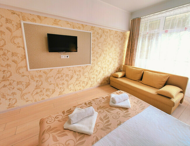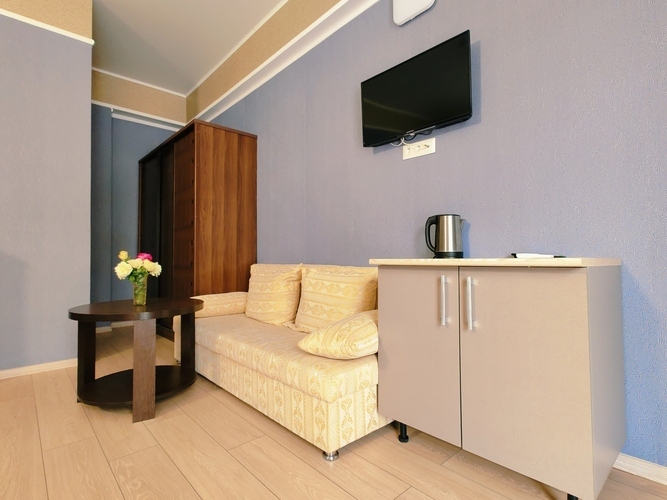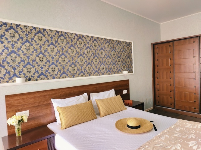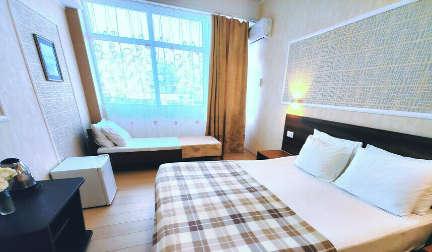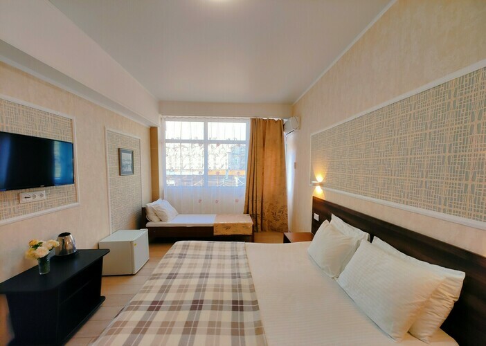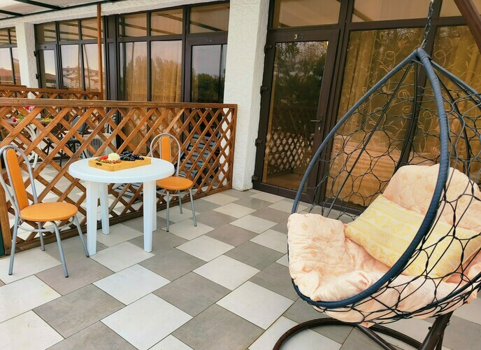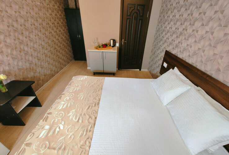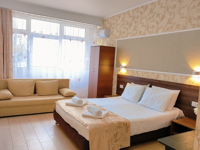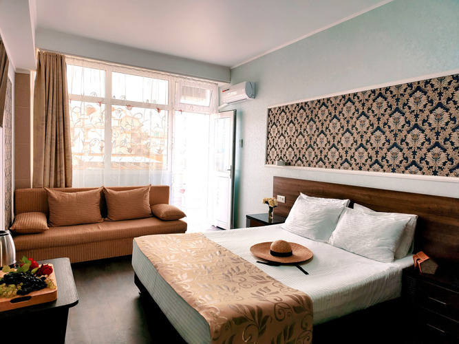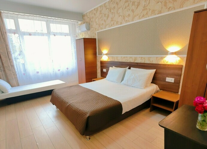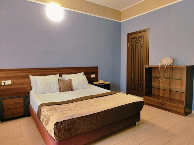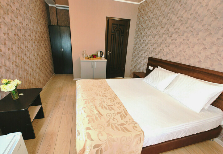 Комфортный 2-х местный номер категории полулюкс с террасой. Номер оснащен всем необходимым для вашего отдыха: 2-х спальная кровать, прикроватные тумбочки или журнальный столик, шкаф для одежды, ЖК-телевизор, сплит-система, мини-холодильник, электрочайник.Ванная комната: душевая, раковина, унитаз, набор полотенец, набор одноразовой косметики. Терраса: летняя мебель