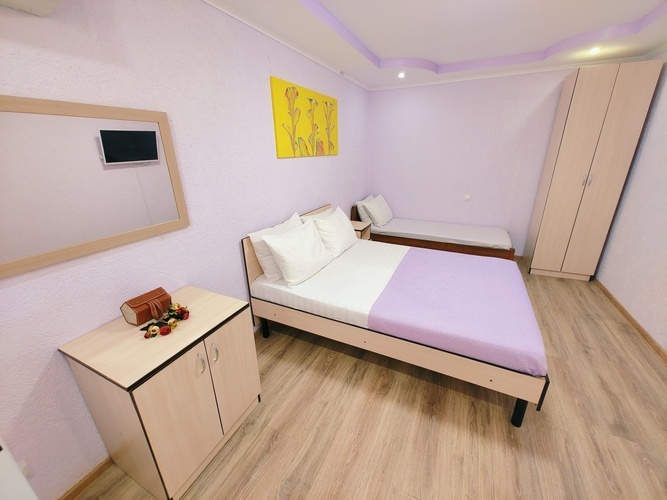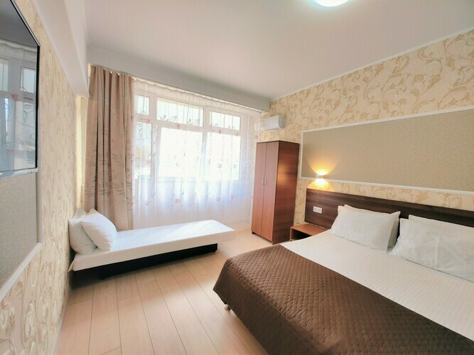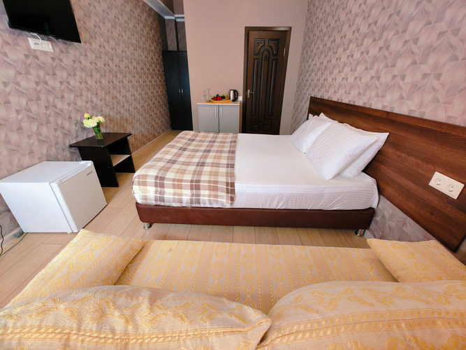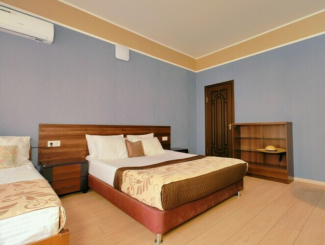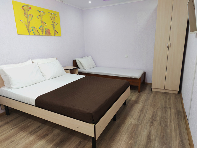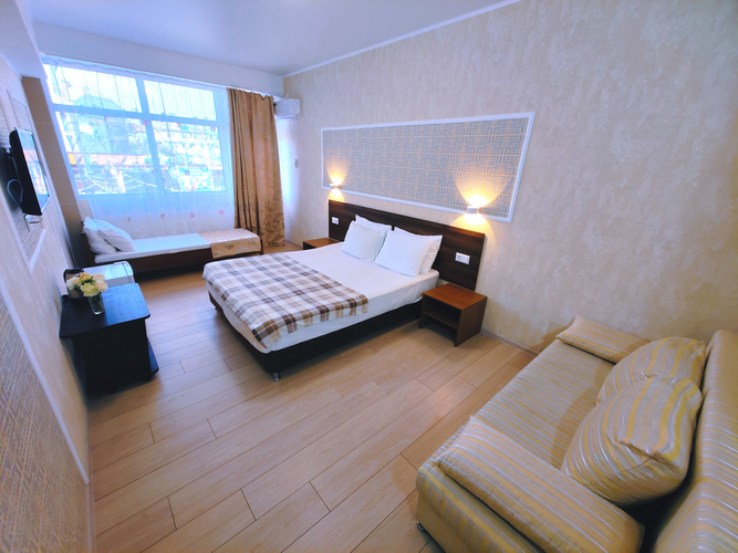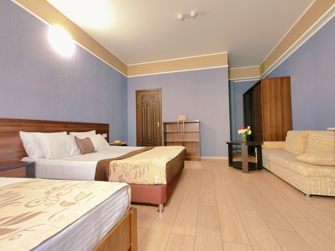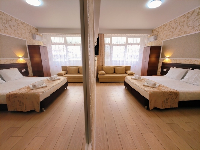 Двухкомнатные Семейные номера, прекрасно подойдут для семейного отдыха или отдыха дружной компанией. В номере: две односпальные кровати, двухспальный диван, прикроватные тумбочки, журнальный столик, шкаф для одежды, зеркало, ЖК-телевизор, сплит система,электрочайник Ванная комната: душевая, раковина, унитаз, набор полотенец, набор одноразовой косметики.