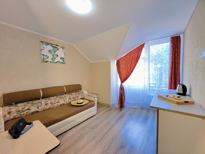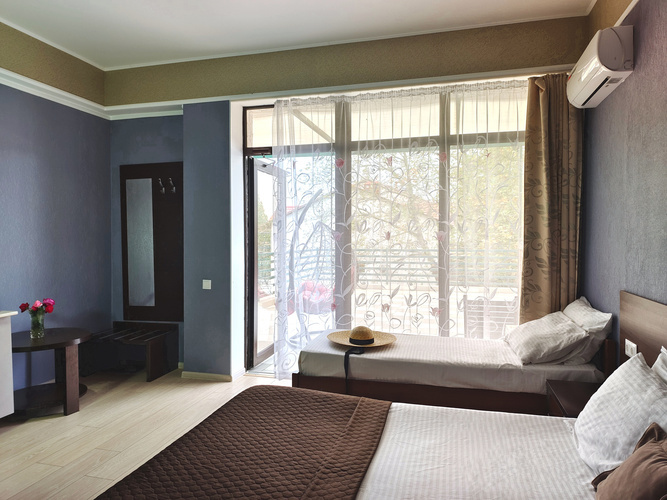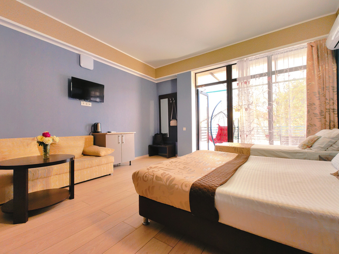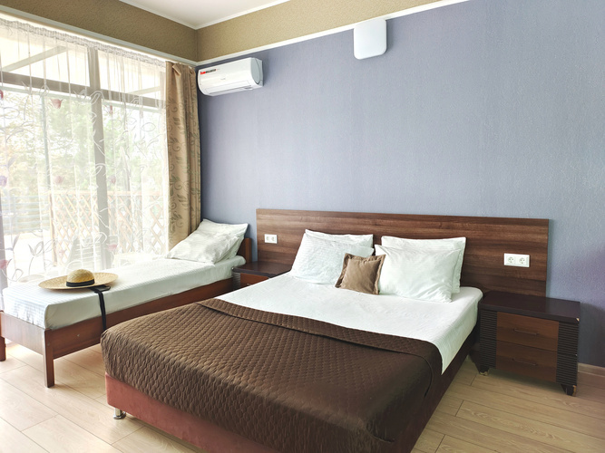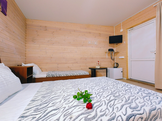 Номер выполнен в отделке из натурального дерева с террасой и отдельным входом в номер через индивидуальную зону отдыха. В номере: две односпальные кровати-боксы (с возможностью трансформации в двуспальную), двуспальный диван, прикроватные тумбочки , журнальный столик , шкаф для одежды, ЖК-телевизор,кондиционер ,мини-холодильник, электрочайник Ванная комната: душевая, раковина, унитаз,набор полотенец,набор одноразовой косметики Индивидуальная зона отдыха с отдельным входом в номер: летняя мебель