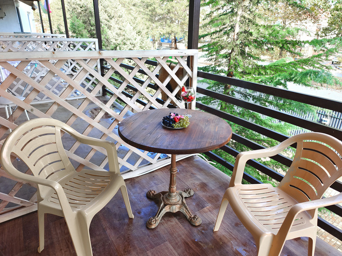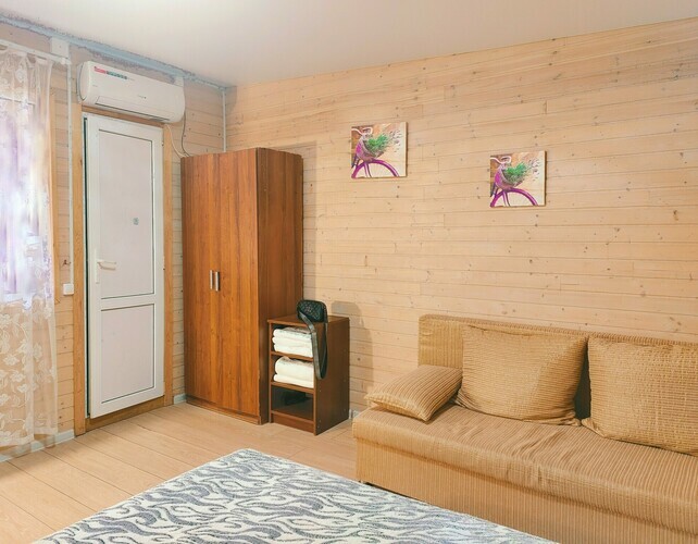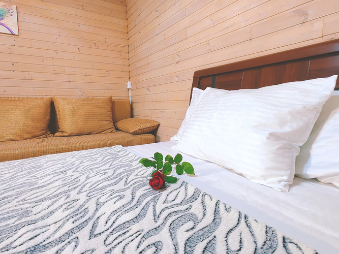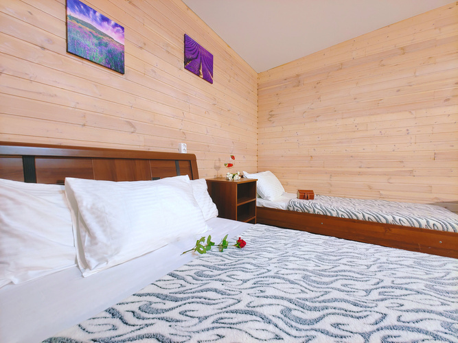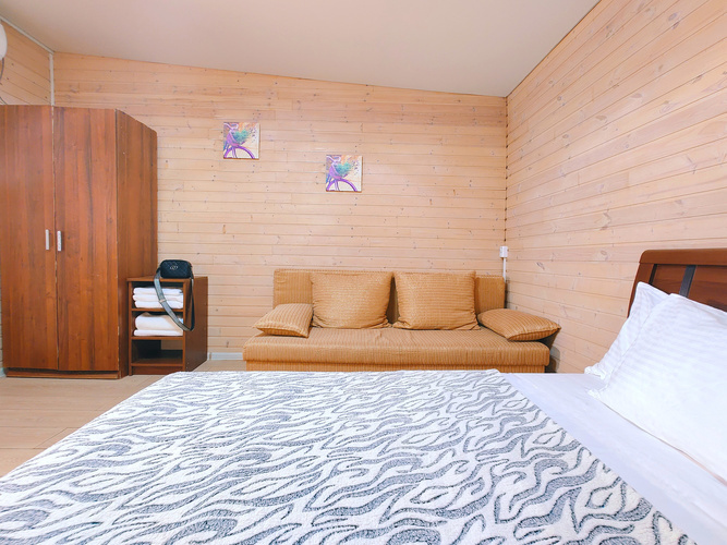 Номер выполнен в отделке из натурального дерева с террасой и отдельным входом в номер через индивидуальную зону отдыха. В номере: две односпальные кровати-боксы (с возможностью трансформации в двуспальную), односпальный диван, прикроватные тумбочки , журнальный столик , шкаф для одежды, ЖК-телевизор,кондиционер ,мини-холодильник, электрочайник Ванная комната: душевая, раковина, унитаз,набор полотенец,набор одноразовой косметики Индивидуальная зона отдыха с отдельным входом в номер: летняя мебель