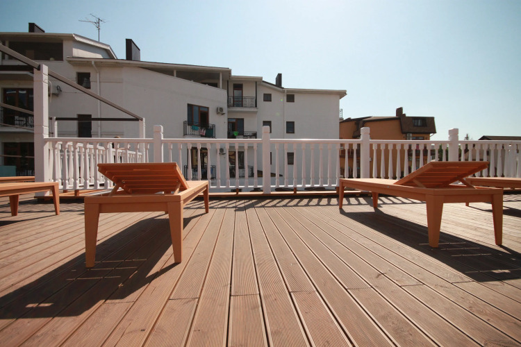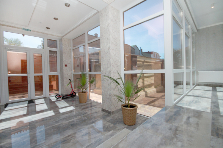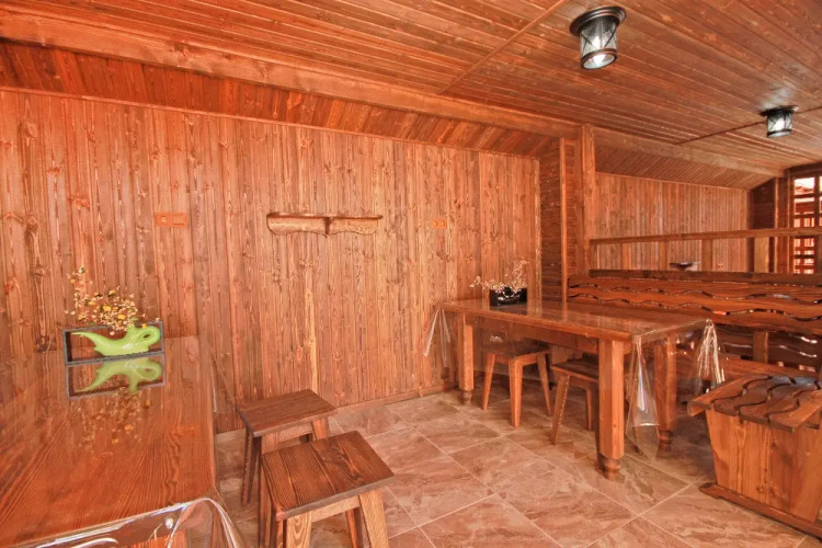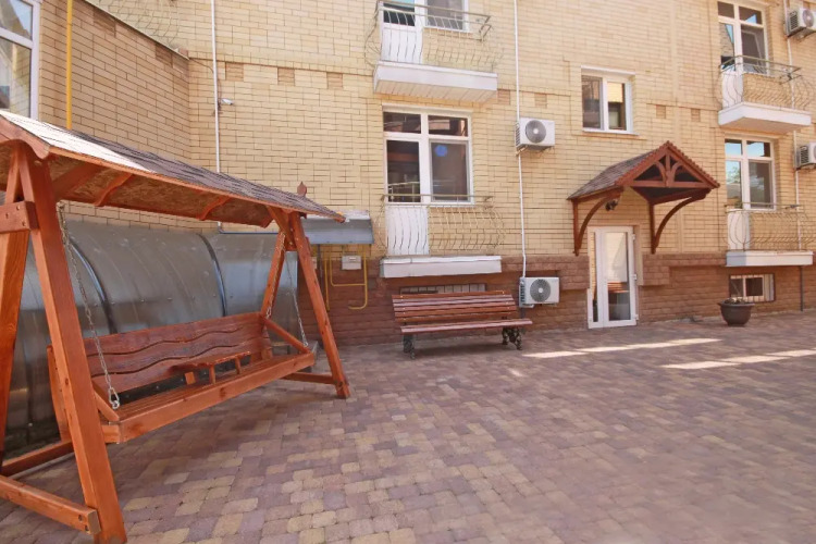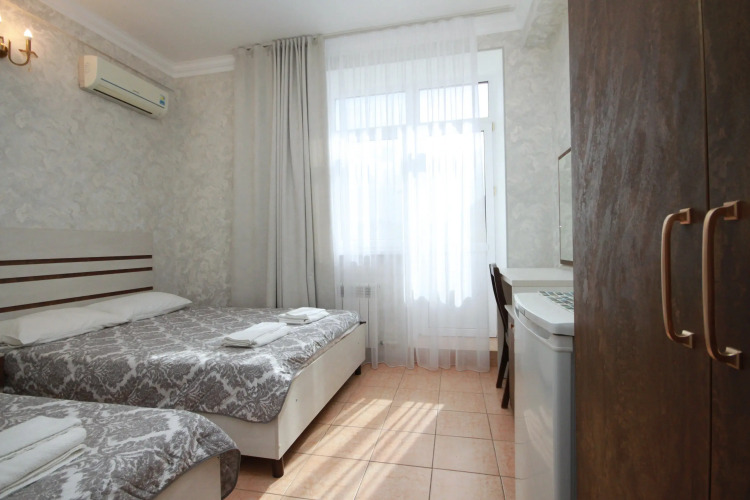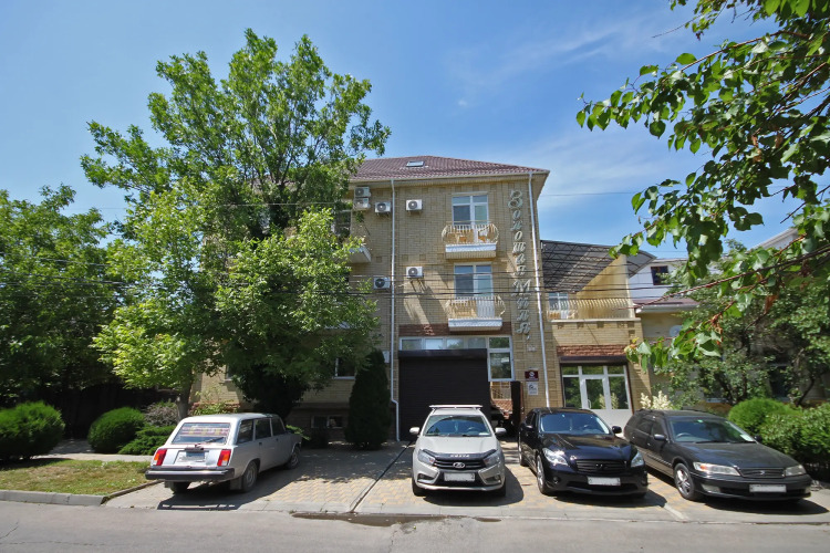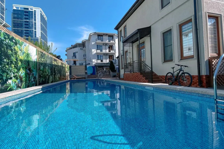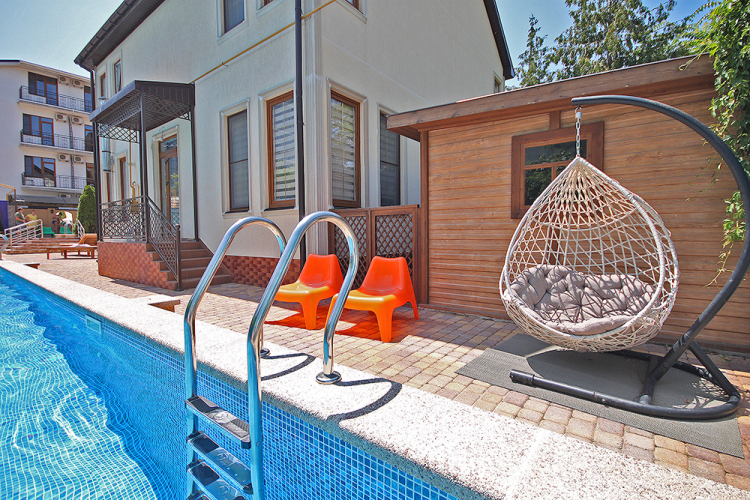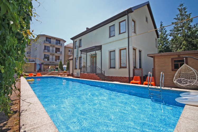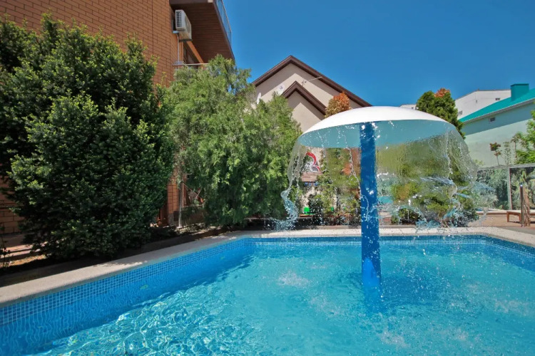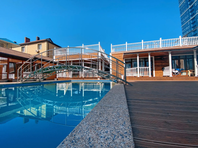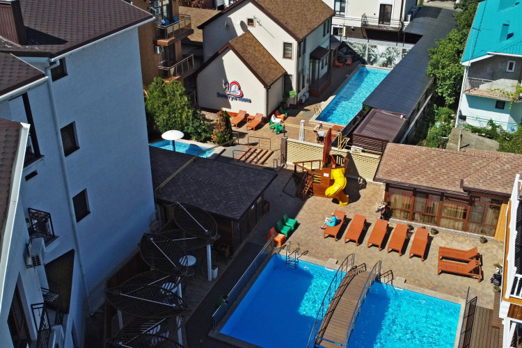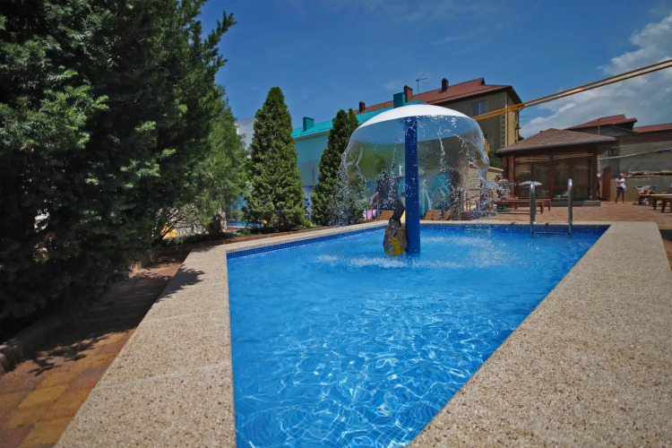 У гостевого дома закрытая территория. Есть 3 бассейна: для детей — 3 м на 4 м с глубиной 1,6 м, для взрослых — 5 м на 16 м с глубиной 1,6 м, а также 9 м на 11 м с глубиной 1,6 м. Также имеются: зона для загара, лежаки, детская площадка, двор со столиками, лавочки, качели, беседки, навес для отдыха. Ведётся видеонаблюдение. Есть бесплатный Wi-Fi. Столовая с домашней кухней работает по меню. На каждом этаже, кроме мансардного, есть терраса со столиками для отдыха. Для гостей на личном транспорте доступна парковка, наличие мест нужно уточнять. Раз в 10 дней с 20:00 до 21:30 проводится анимационная программа для детей и музыкальные вечера для взрослых.